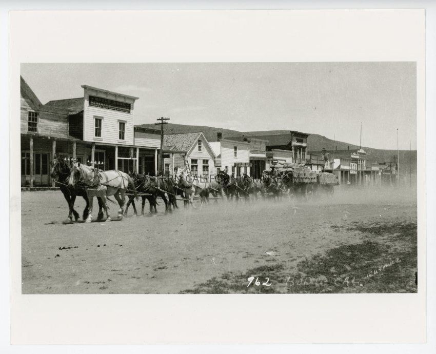 Photo of a team of horses hauling two wagons through the town of Bodie. Written on front: Bodie, Cal. A. A. Forbes, 962.