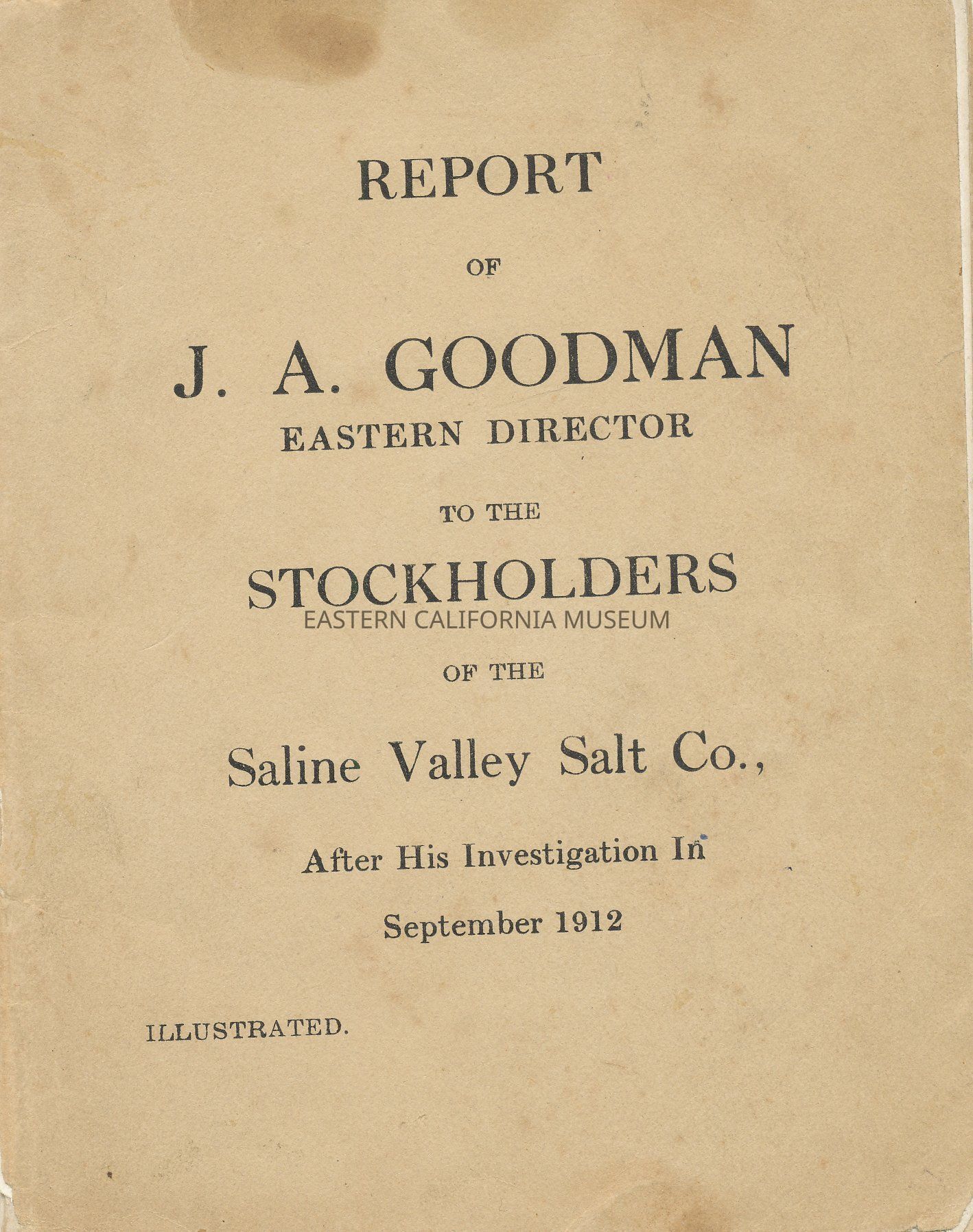 Booklet, "Report of J. A. Goodman Eastern Director to the Stockholders of the Saline Valley Salt Co., After His Investigation in September 1912. Illustrated", 21 pages, including blanks; photographs included.Collection