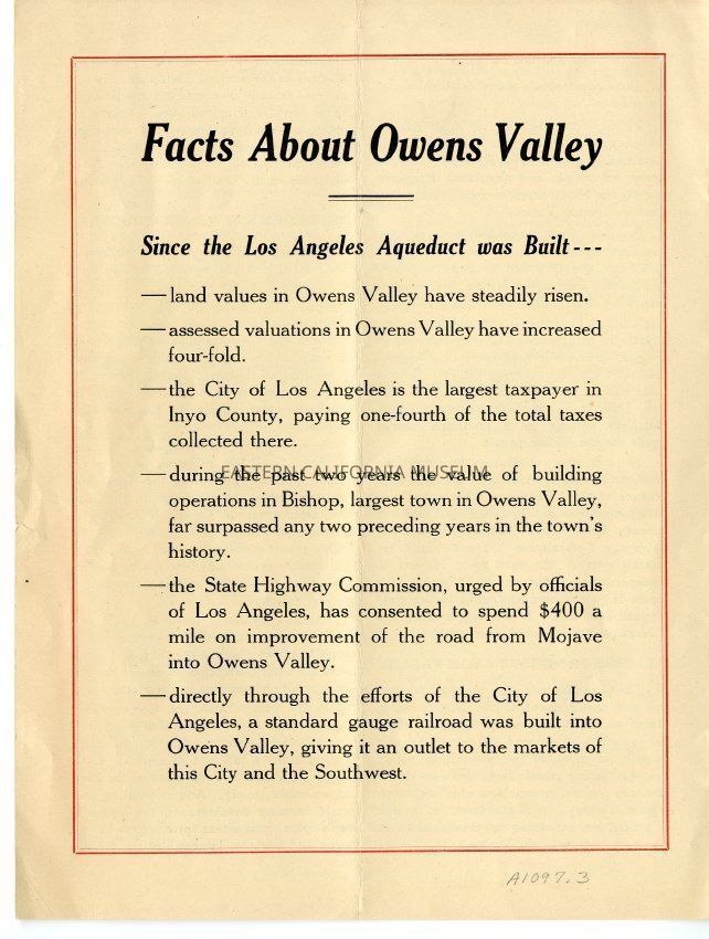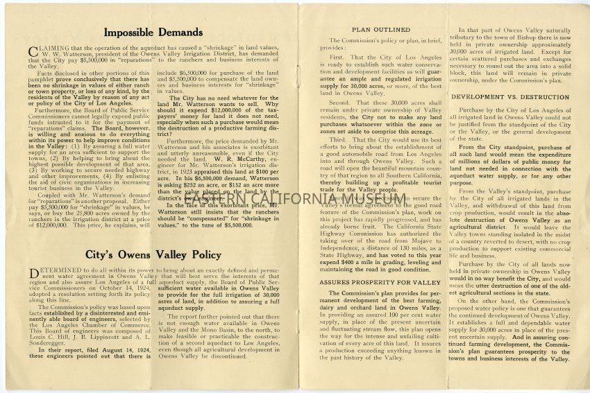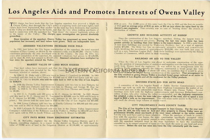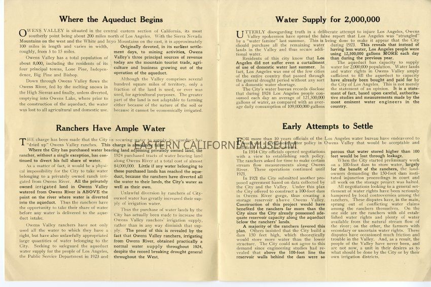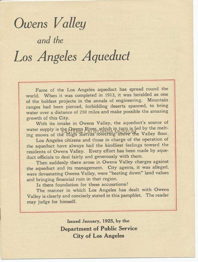 Booklet titled "Owens Valley and the Los Angeles Aqueduct," issued January 1925 by the Department of Public Service, City of Los Angeles. Headings include "Where the Aqueduct Begins," "Ranchers Have Ample Water," "Water Supply for 2,000,000," "Early Attempts to Settle," "Los Angeles Aids and Promotes Interests of Owens Valley," "Impossible Demands," "City's Owens Valley Policy," and "Facts About Owens Valley."