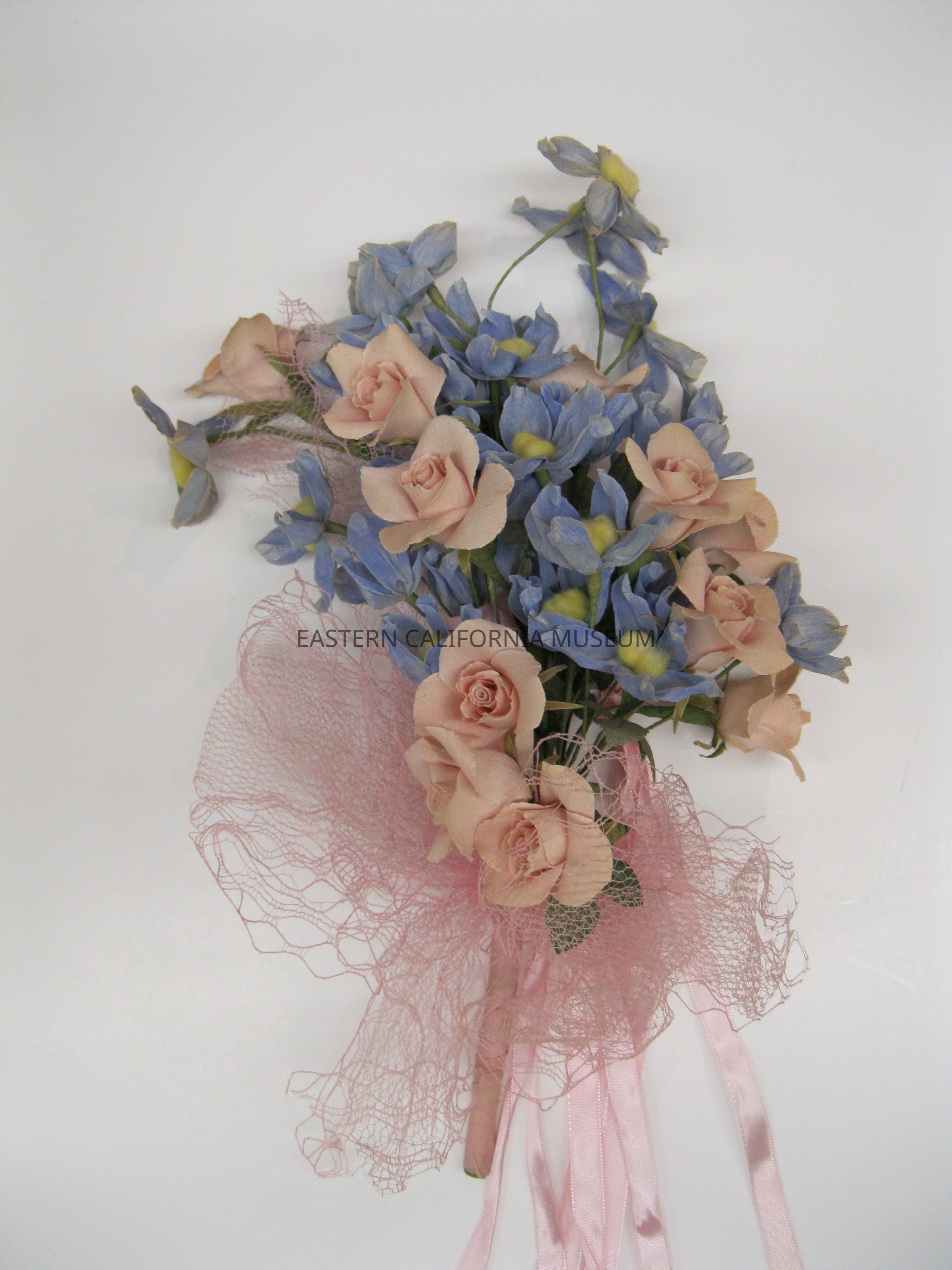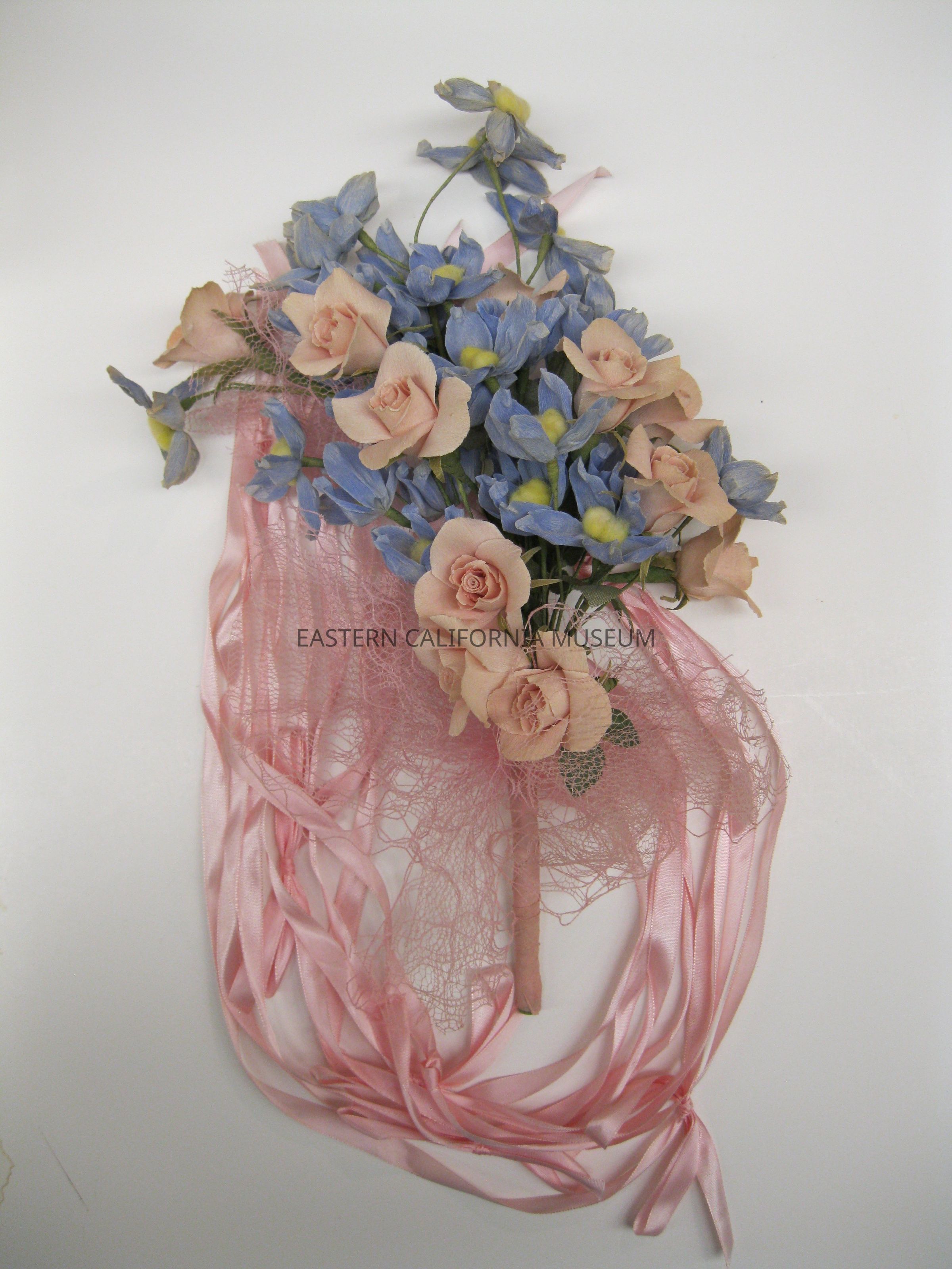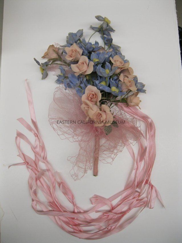 Bouquet consisting of pink and blue flowers with green leaves, pink ribbon and pink netting. It and its accompanying headpiece were worn by attendant Claire Ayako Harada Nakashima (09/29/1923-12/19/2019). They were made by the Manzanar Flower Shop for the wedding of Mark Nakamura and Anna Marie (Aiko) Miyamoto on February 27, 1944, which was held at the Manzanar Catholic Church and officiated by Maryknoll priest Father Leo Steinbach.Collection