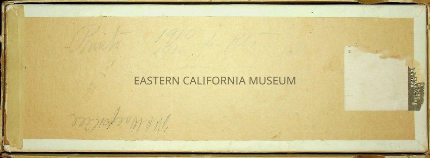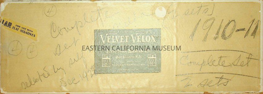Cardboard box with label for "Velvet Velox, made by Eastman Kodak Co." There is a blue stamp on reverse with the date of Jan. 1, 1914. Extensive writing in pencil on front and back of box. The front includes: "Complete set selected by self and Nelda Dec. 1928. (2 sets) 1910-11. Compelte set." The back includes: "Prints 1910-1911 for [illegible, starts witha K]. M. A. Wolfskill."