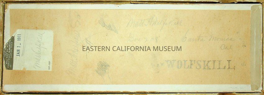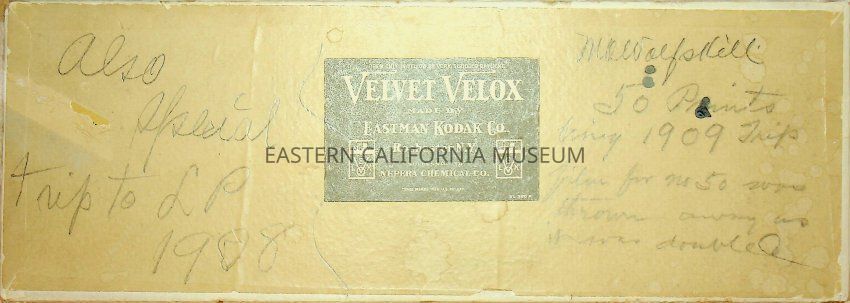 Cardboard box with label for "Velvet Velox, made by Eastman Kodak Co." There is a blue stamp on reverse with the date of Jan. 1, 1911. Extensive writing in pencil on front and back of box. The front includes: "M. A. Wolfskill 50 prints [illegible, maybe being?] 1909 trip. Film for No. 50 was thrown away as it was doubled. Also special trip to LP 1908." The back includes: "M. A. Wolfskill, Box 208, Santa Monica, Cal." His name has been written many times on the back.