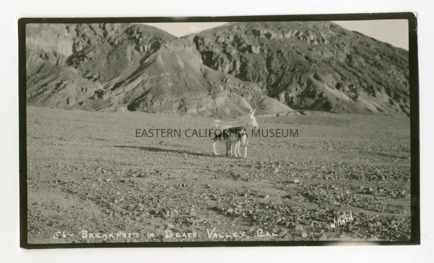 Photo of two burros, a mother and child, in Death Valley. The child is feeding. It has ID #56.