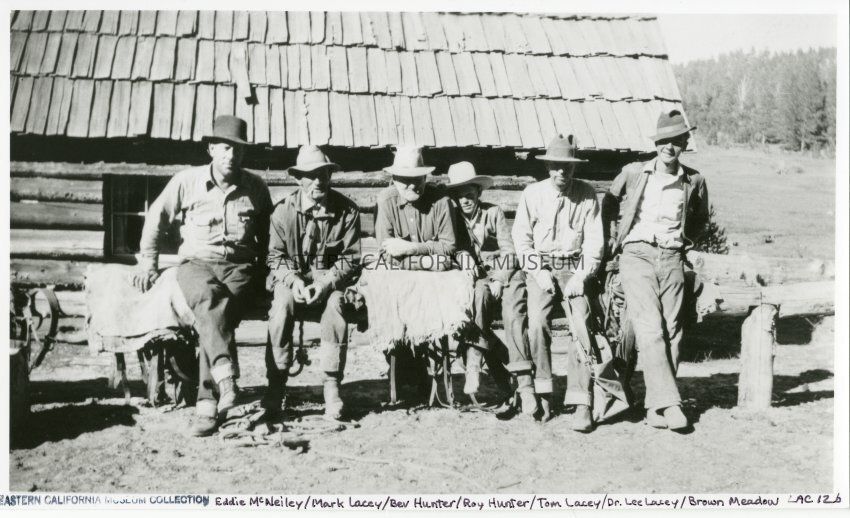 B&W glossy print: 6 men sitting on a hitching post; Eddie McNeiley, Mark Lacey, Bev [Beveridge] Hunter, Roy Hunter, Tom Lacey, Dr. Lee Lacey - Brown Meadow ; from ECM collection (Lacey collection)