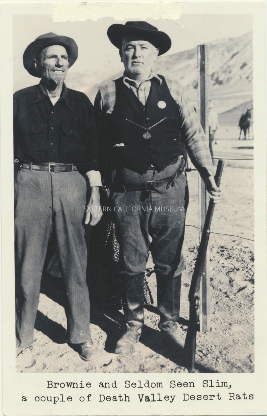 Photo postcard titled, "Brownie and Seldom Seen Slim, a couple of Death Valley Desert Rats." Shows Charles Ferge, AKA Seldom Seen Slim, and a larger man holding a rifle standing shoulder to shoulder.