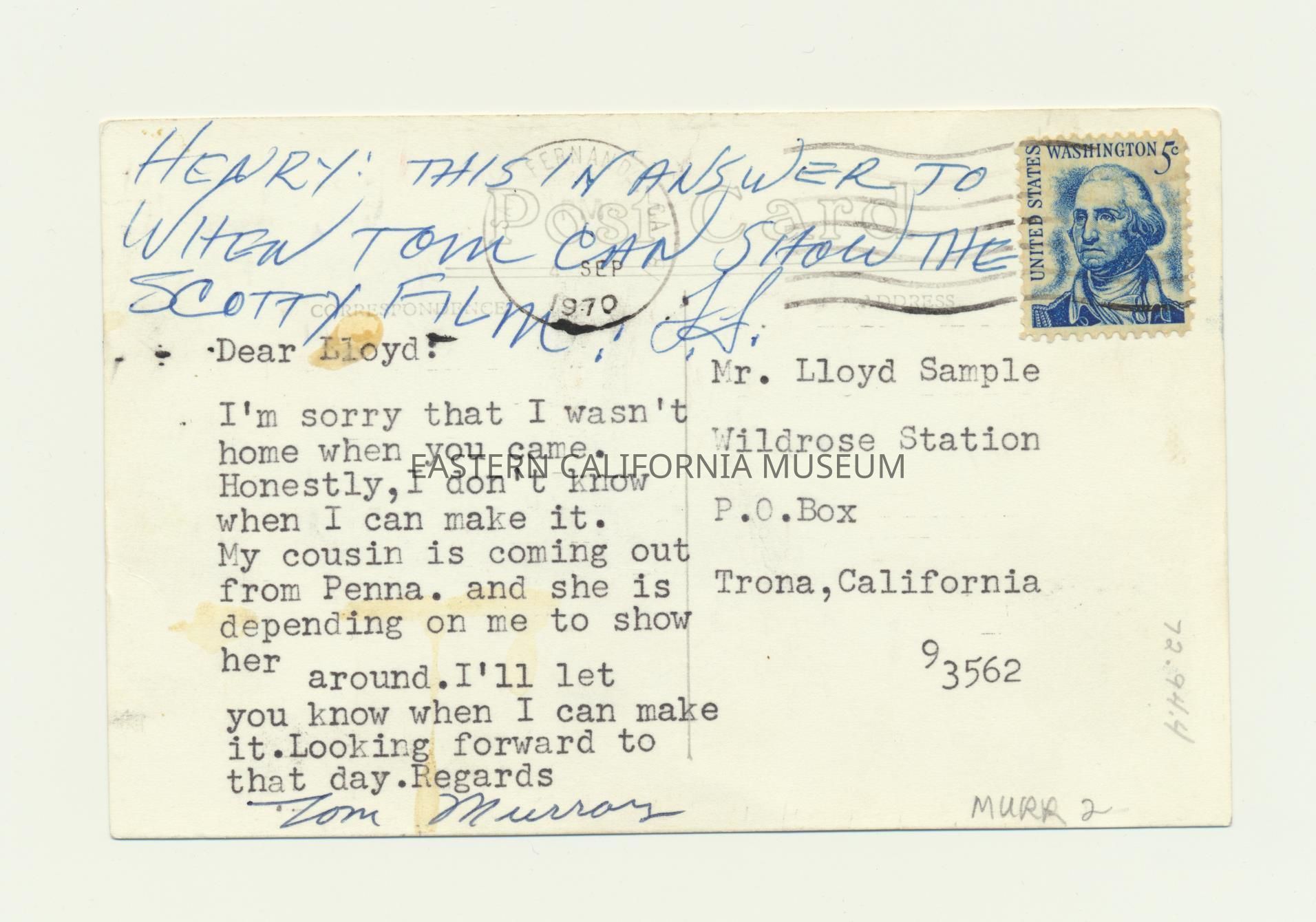 This postcard was mailed from San Fernando, CA on 19/04/1970 from Tom Murray to Lloyd Sample of Wildrose Station (Trona address). It has a blue five cent George Washington stamp. It appears Mr. Sample passed along the postcard to Henry [Raub?] with the note, "Henry: this in answer to when Tom can show the Scotty film. L.S."