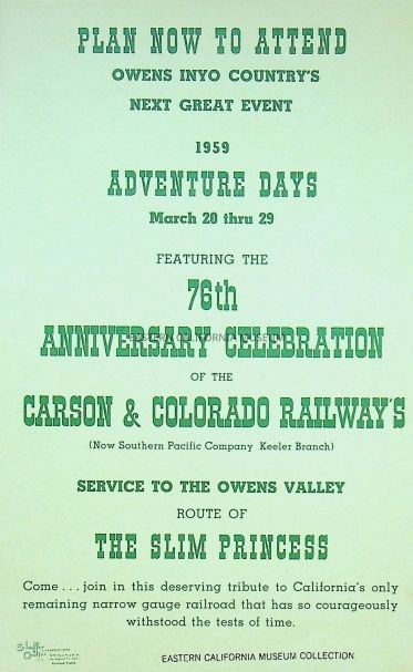 Advertisement for 1959's "Adventure Days" featuring the 76th anniversary celebration of the Carson and Colorado Railway's service to the Owens Valley. It is printed double sided on green paper.Publication Details
