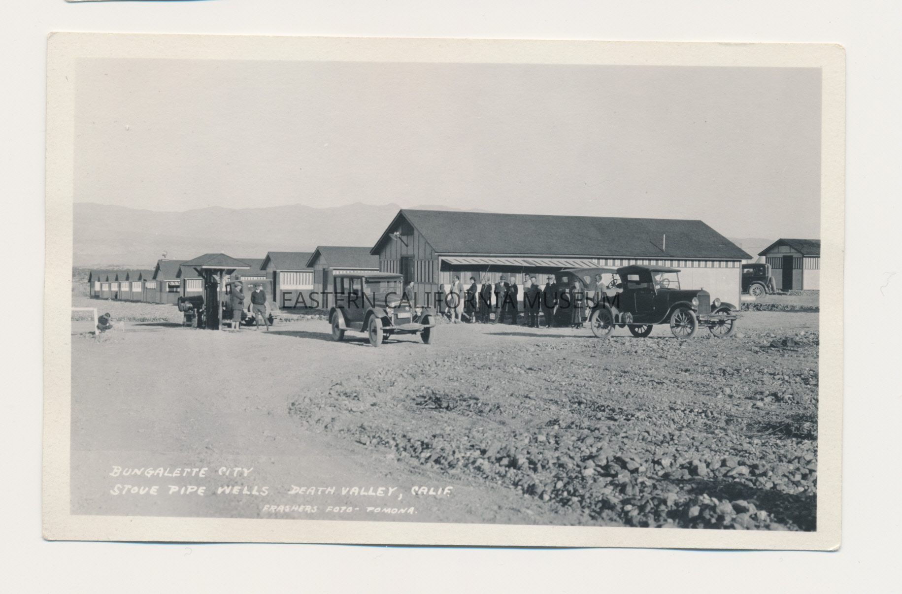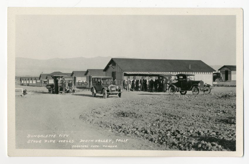 Photo postcard titled, "Bungalette City, Stove Pipe Wells, Death Valley, Calif." There are several vehicles, buildings, and people standing around. The photographer was Burton Frasher of Pomona.Collection