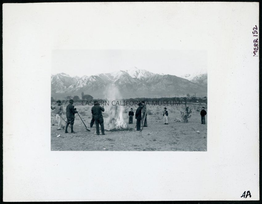 Summary from Library of Congress: "Group of men and boys standing around a small brush fire holding shovels, a pitchfork stands in the right foreground, mountains in background"