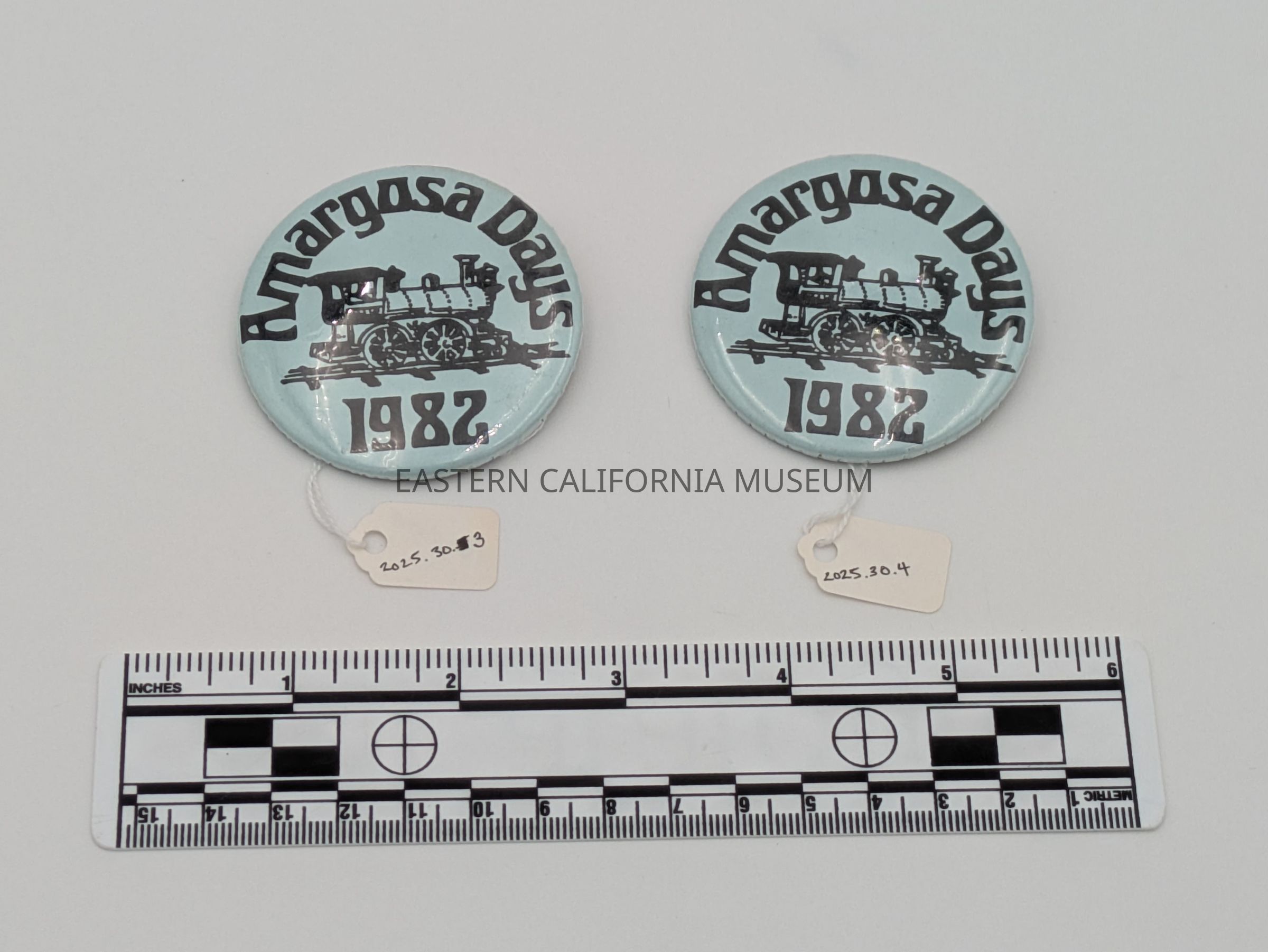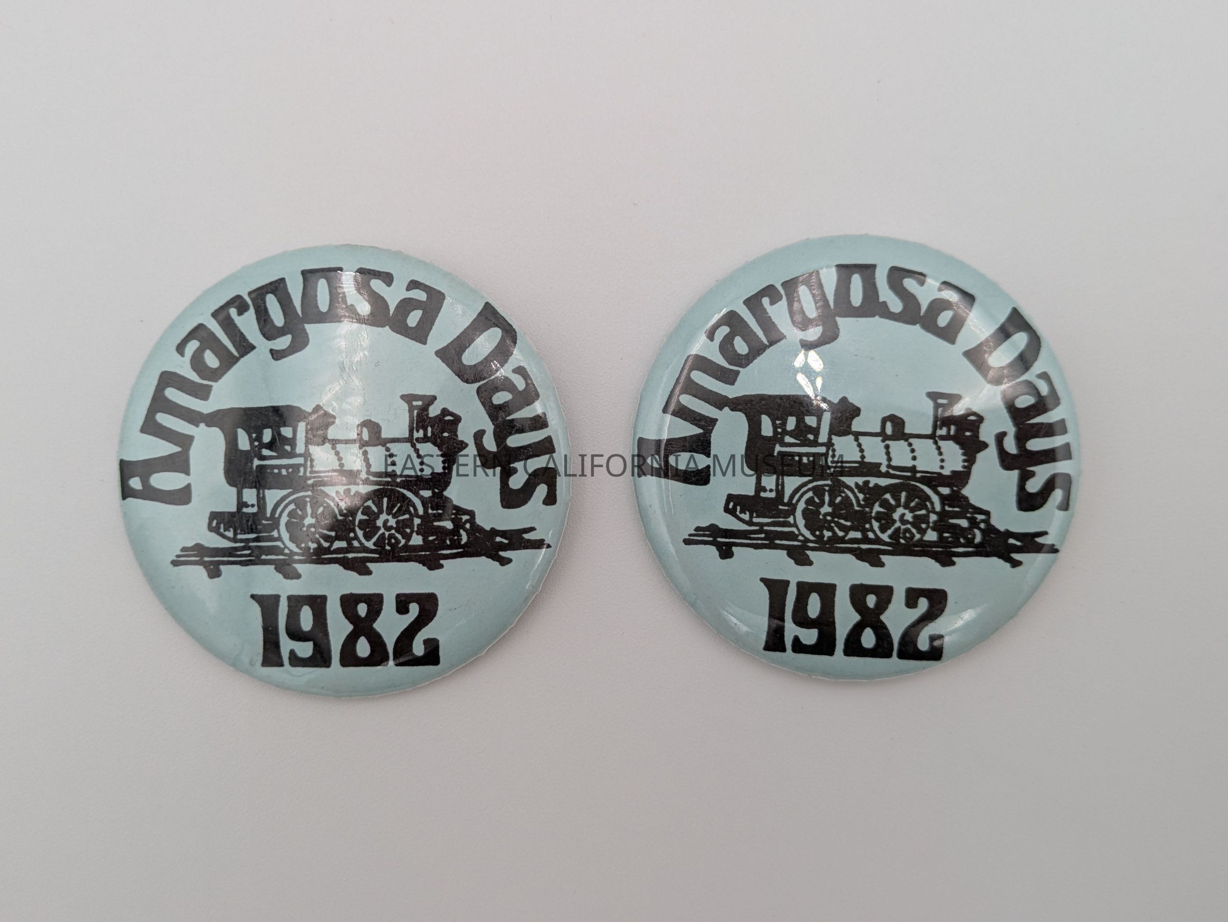 Two buttons from the 1982 Amargosa Days celebration. They are on a light blue background with black ink and an image of a locomotive in the center.
