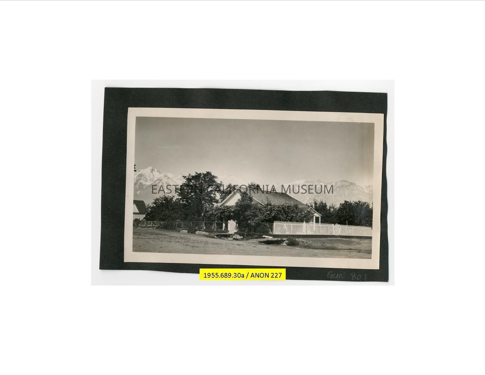 Photo of a house with a white picket fence and the Sierra Nevada mountain range in the background. It has been identified as the Dehy house in Independence.Photograph Details