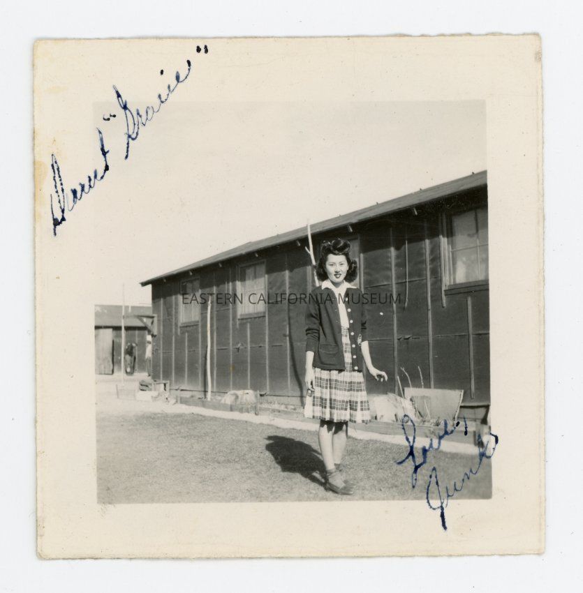 Small square photo of a young woman standing by a barrack. Inscribed in upper left "Dearest 'Gracie'" and in lower right "Love, Junko."