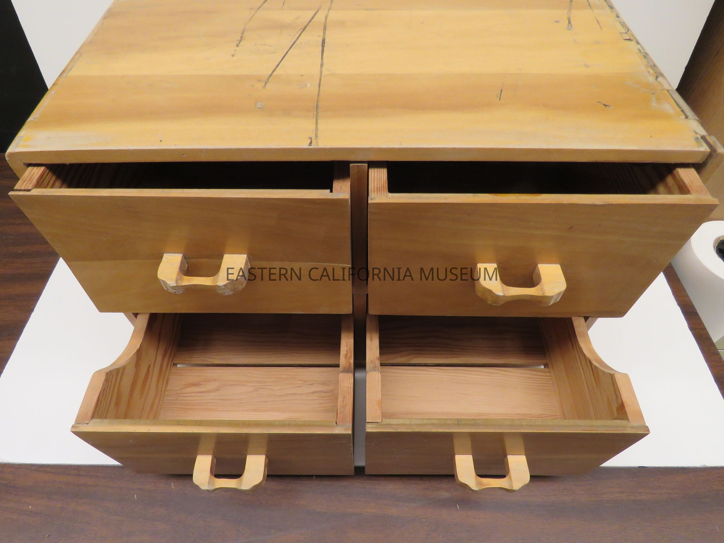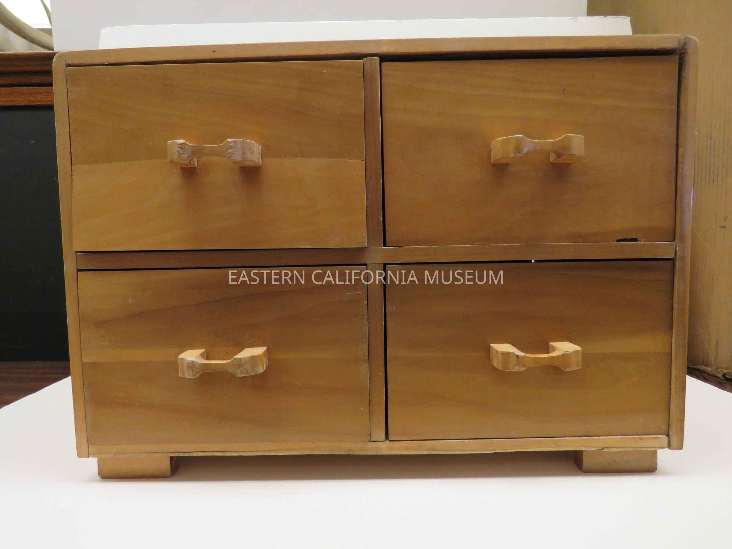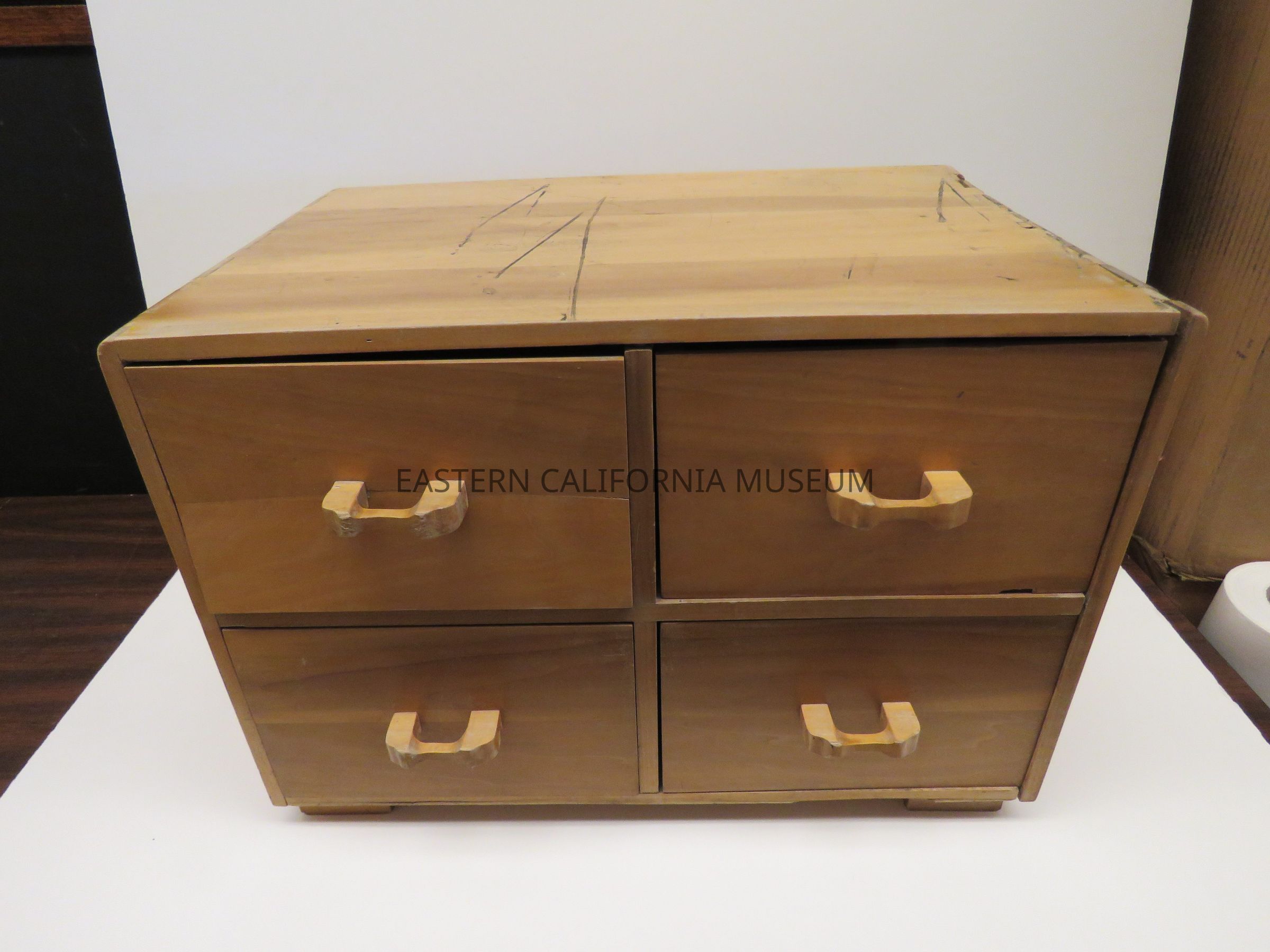 Four-drawer filing cabinet for 4 x 8" sized cards. It is stamped on underneath with "Manzanar Secondary School." There are small triangular pieces of wood "feet" on the bottom and wooden handles on each drawer that are anchored with screws. The top and bottom edge on each side is rounded and jointed, but the right top joint is splitting apart. The top left drawer front is exhibiting signs of warping and splitting across mid-line, and the top is marred and scratched badly.