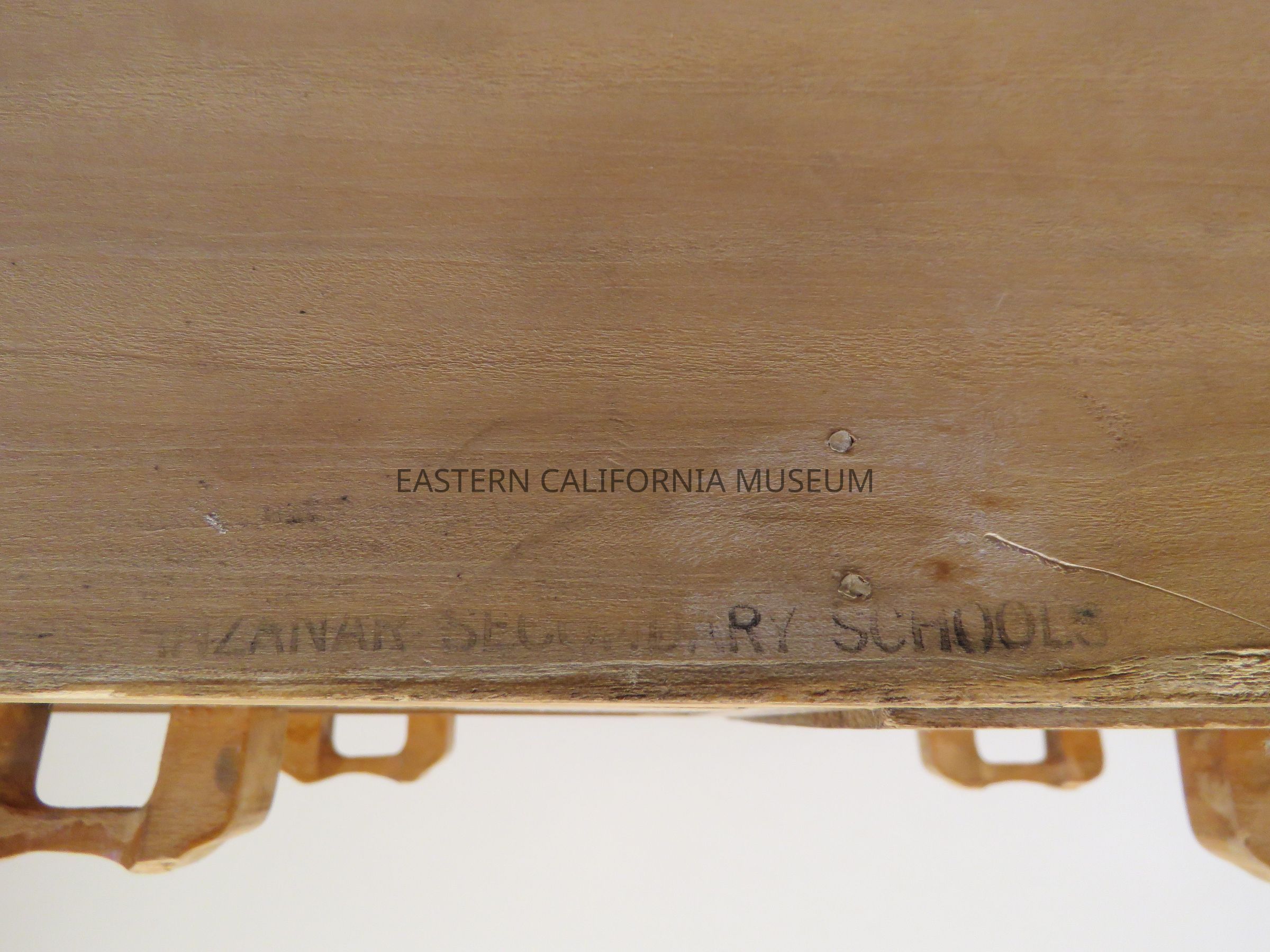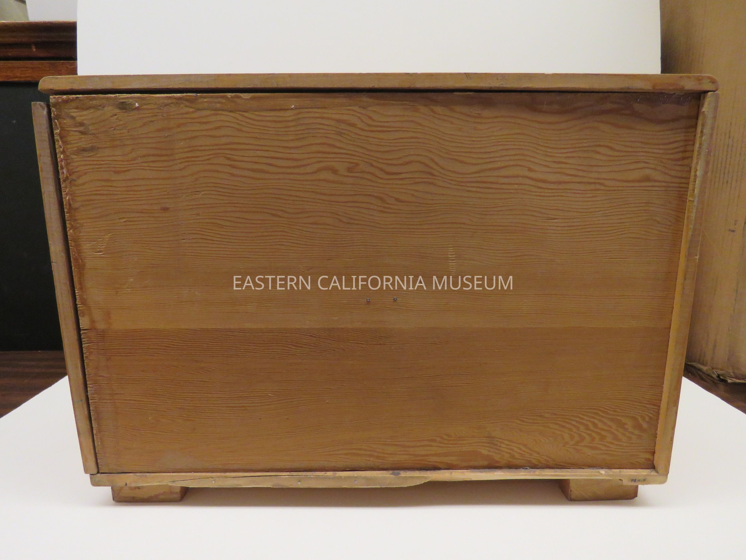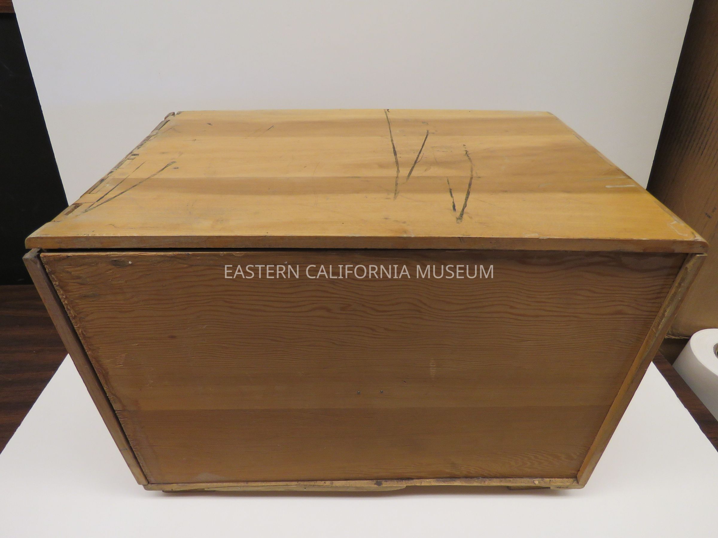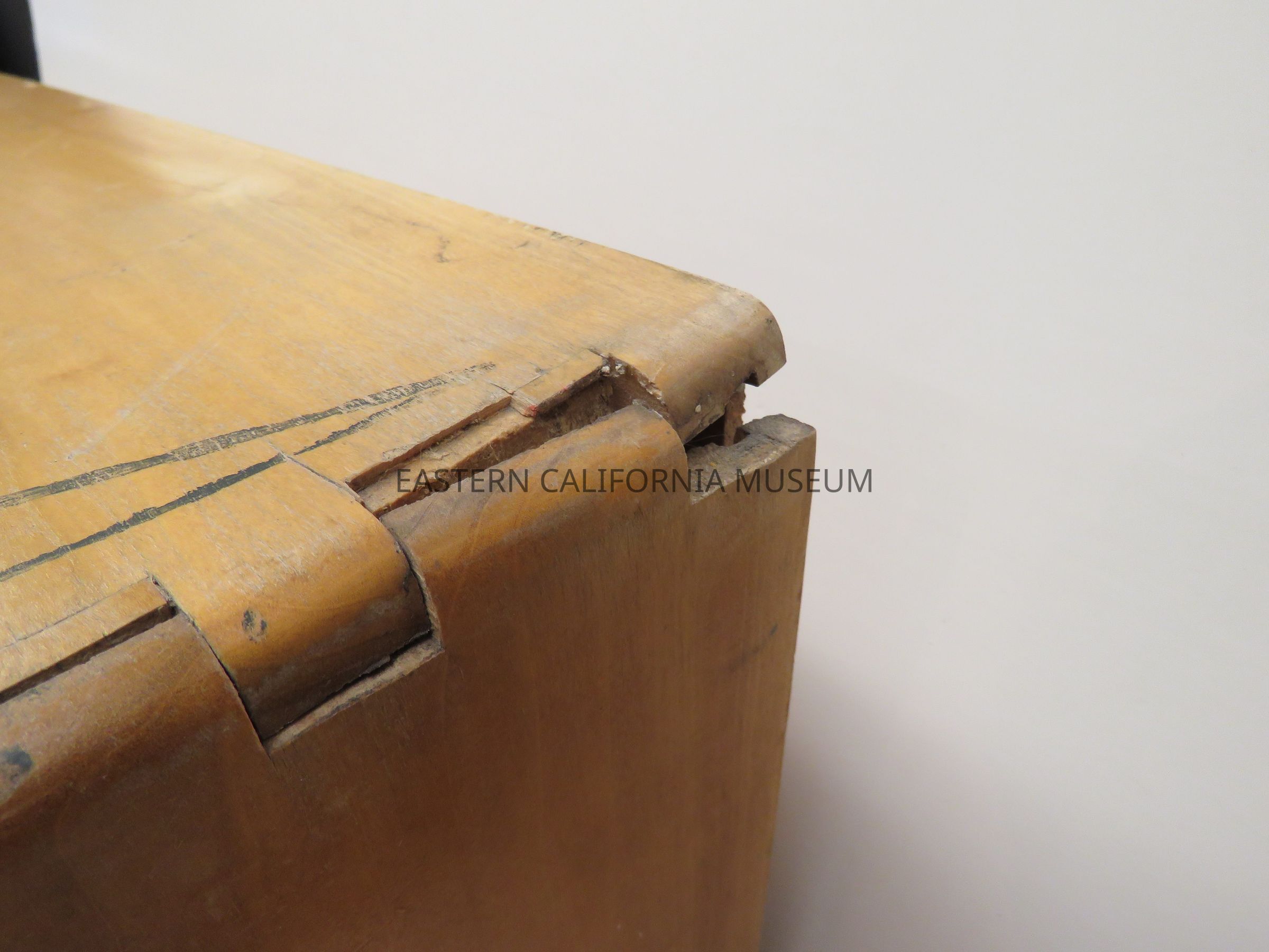 Four-drawer filing cabinet for 4 x 8" sized cards. It is stamped on underneath with "Manzanar Secondary School." There are small triangular pieces of wood "feet" on the bottom and wooden handles on each drawer that are anchored with screws. The top and bottom edge on each side is rounded and jointed, but the right top joint is splitting apart. The top left drawer front is exhibiting signs of warping and splitting across mid-line, and the top is marred and scratched badly.
