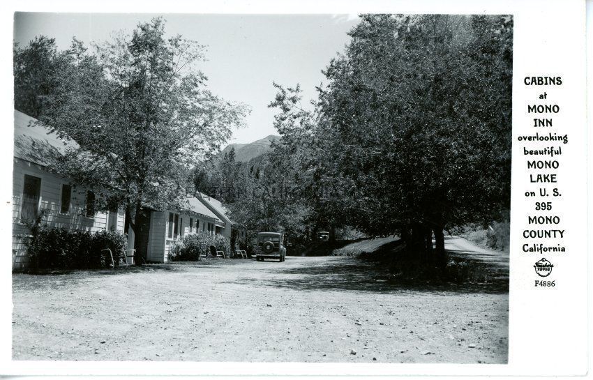 Photo postcard is labeled on front right edge: Cabins at Mono Inn overlooking beautiful Mono Lake on U.S. 395, Mono County, California. Frashers Foto. F4886