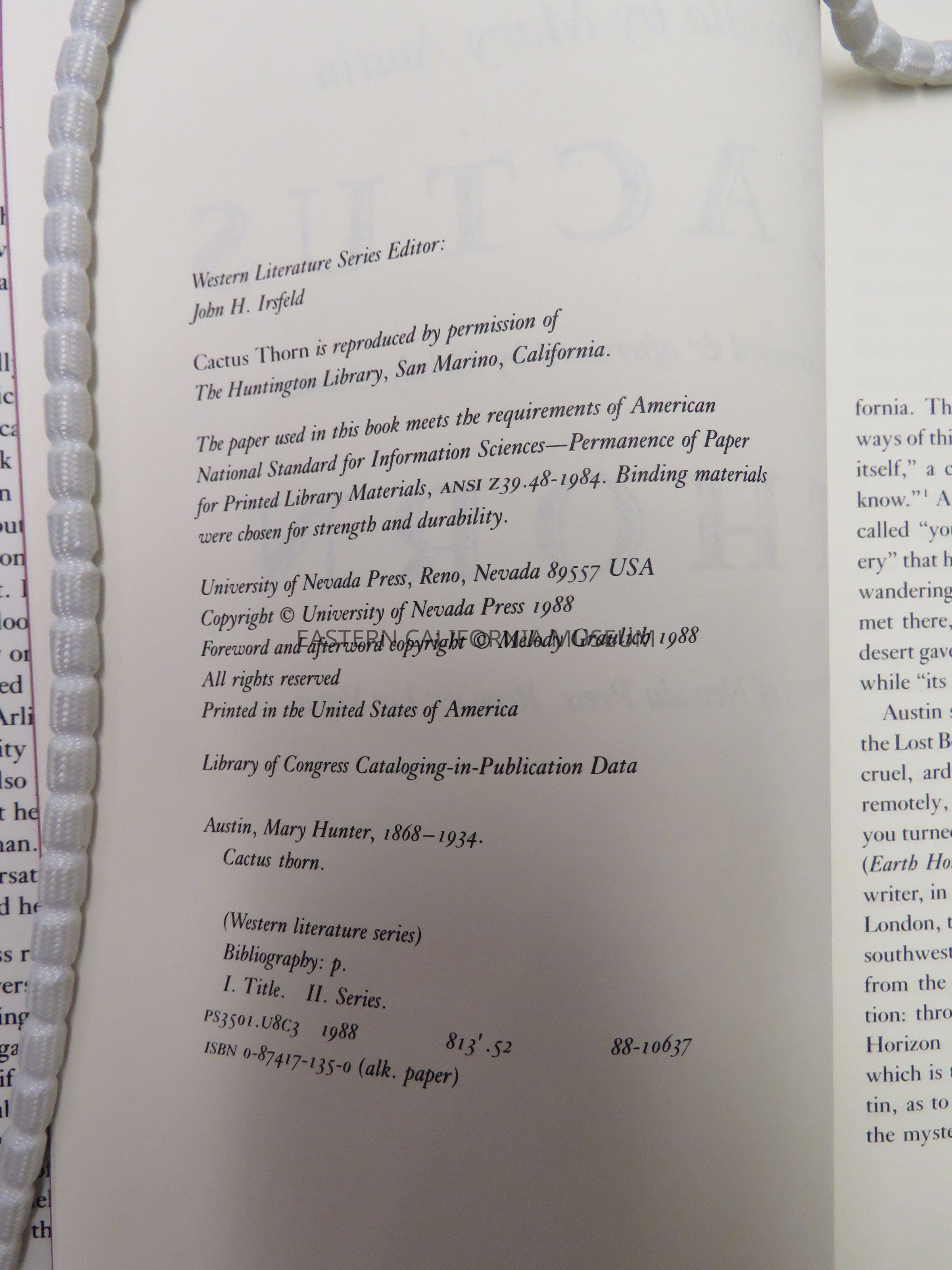 "Cactus Thorn" was published posthumously. Mary Austin had written the novella in 1927, but it was rejected by her publishers Houghton Mifflin Company. The original manuscript is owned by the Huntington Library.Book Details
