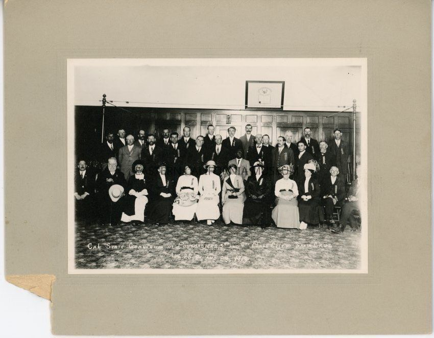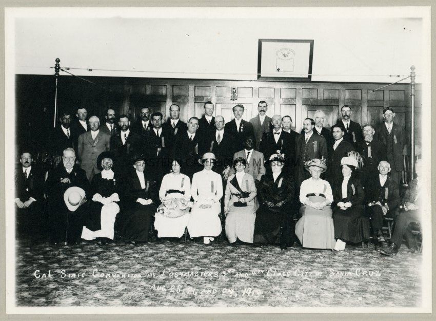 Mounted photo of a group of men and women. It is labeled, "Cal State Convention of Postmasters, 3rd and 4th Class, City of Santa Cruz, August 25, 26, and 27, 1913." The bottom left corner of the matting has been torn off.