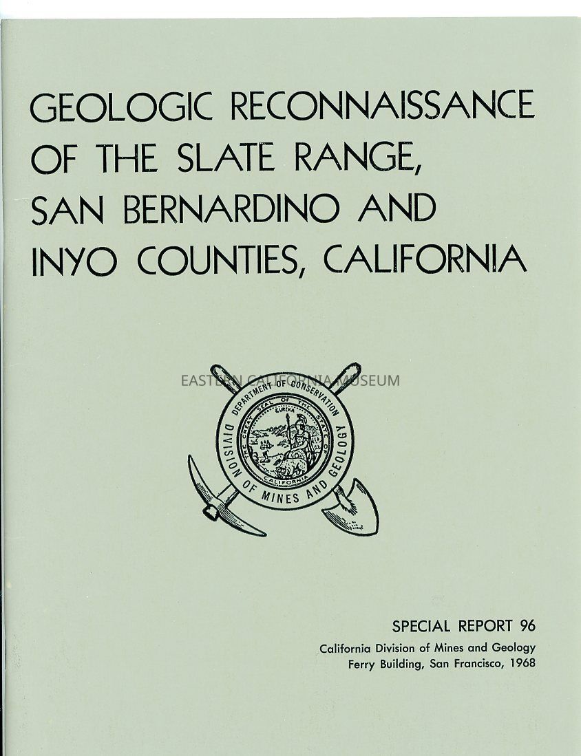 "California Division of Mines and Geology, Special Report 96: Geologic Reconnaissance of the Slate Range, San Bernardino and Inyo Counties, California" contains 1 of 1 maps in back pocket.Publication Details