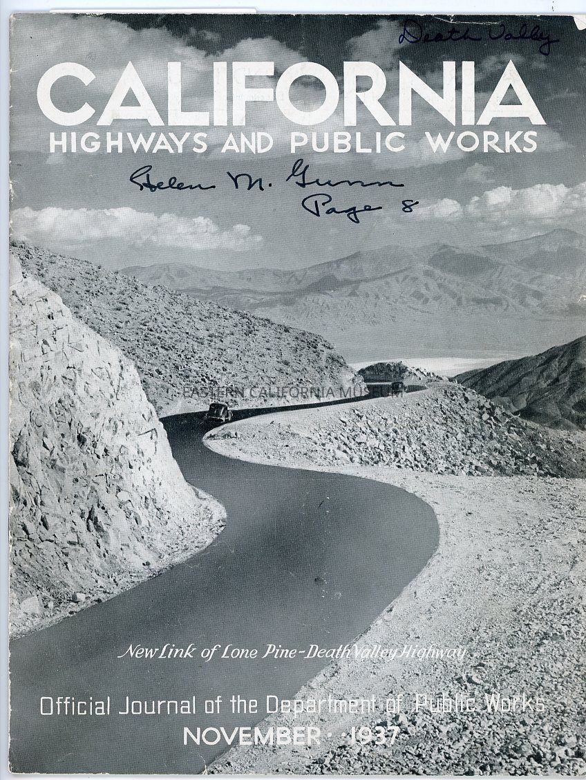 "California Highways and Public Works, Vol. 15, No. 11, November 1937" contains an article titled "New Death Valley Highway."Collection