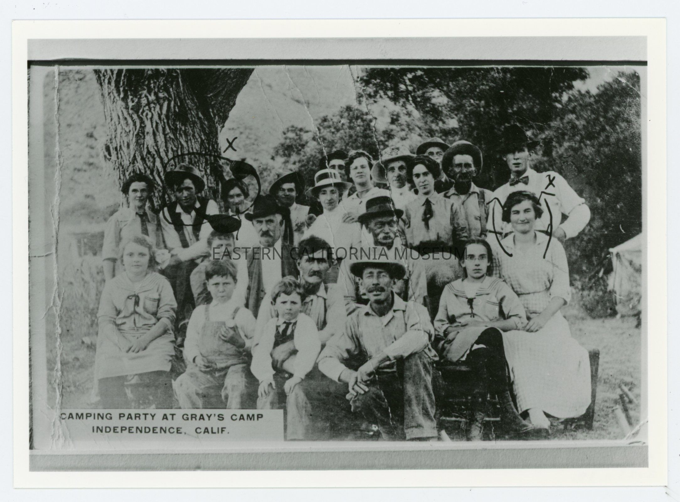 Copy of a photo titled, "Camping Party at Gray's Camp, Independence, Calif." It is of a large group of about 23 people outside by a large tree. There is possibly part of a canvas tent visible on the right side. Three people have been circled or otherwise singled out, but their identities are unknown.Photograph Details