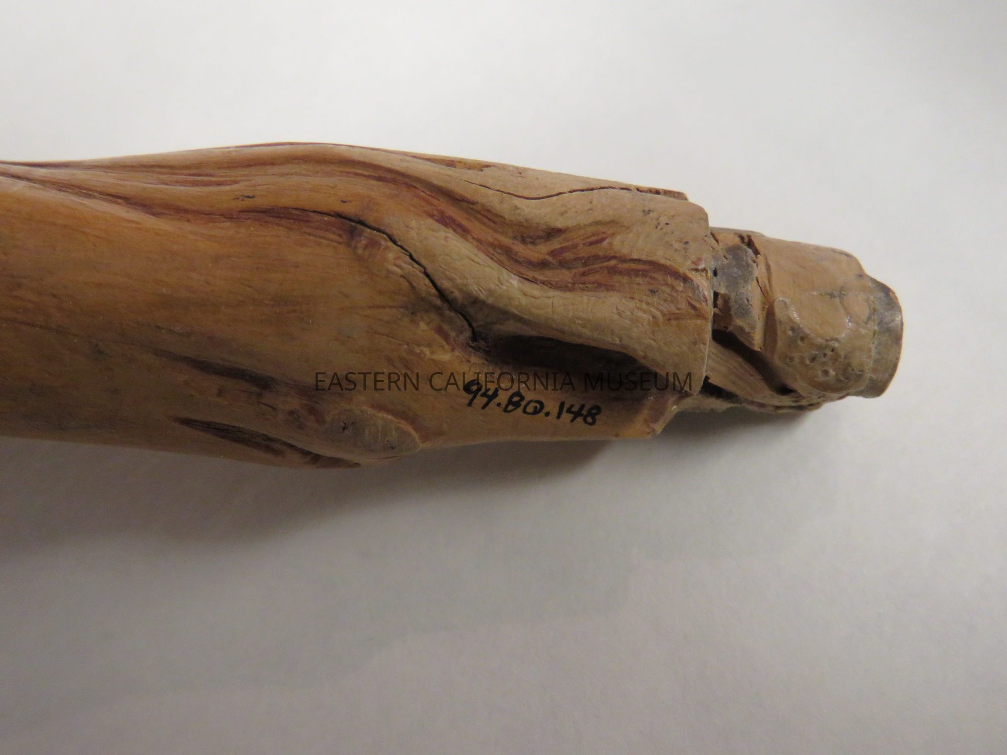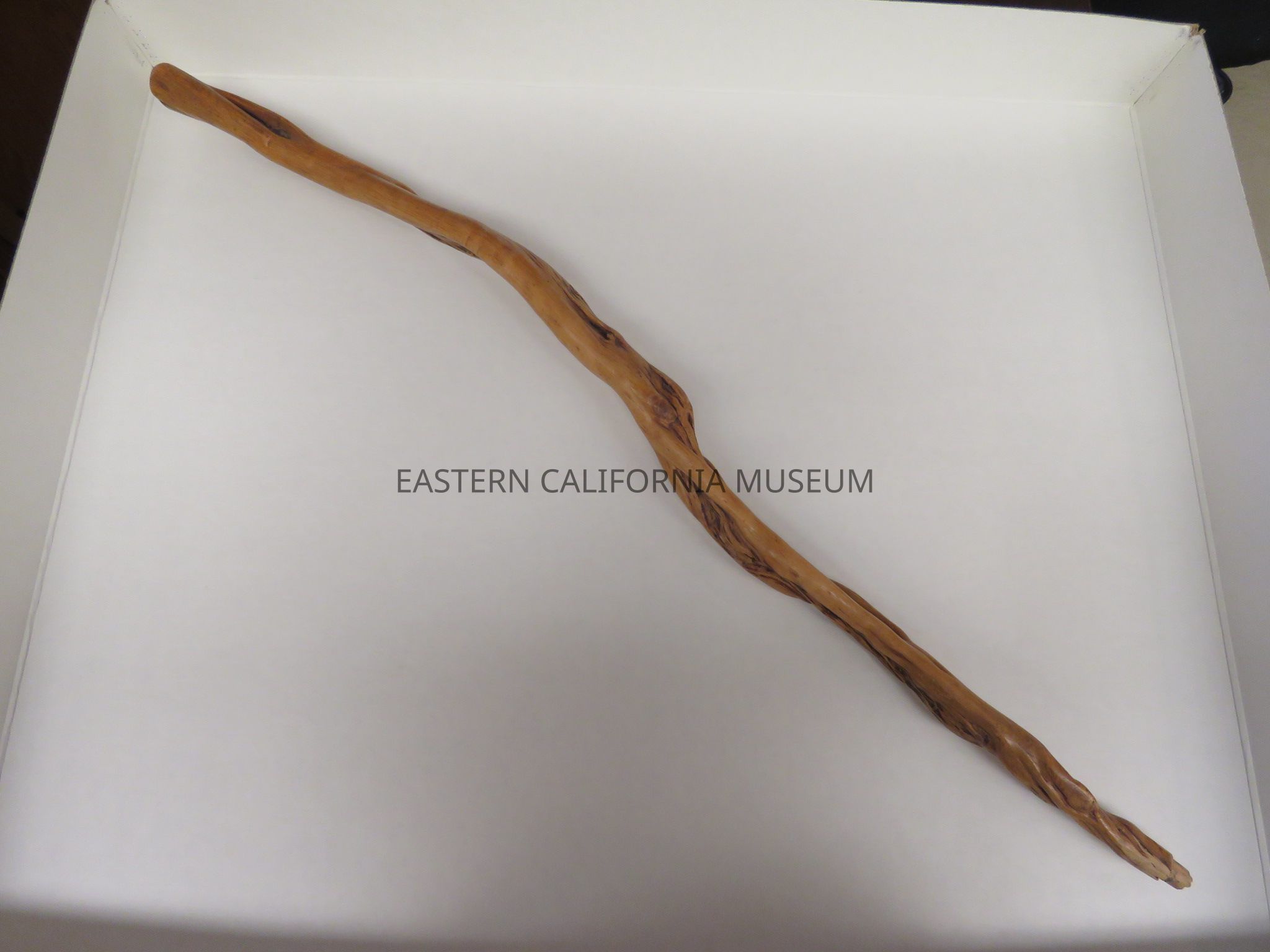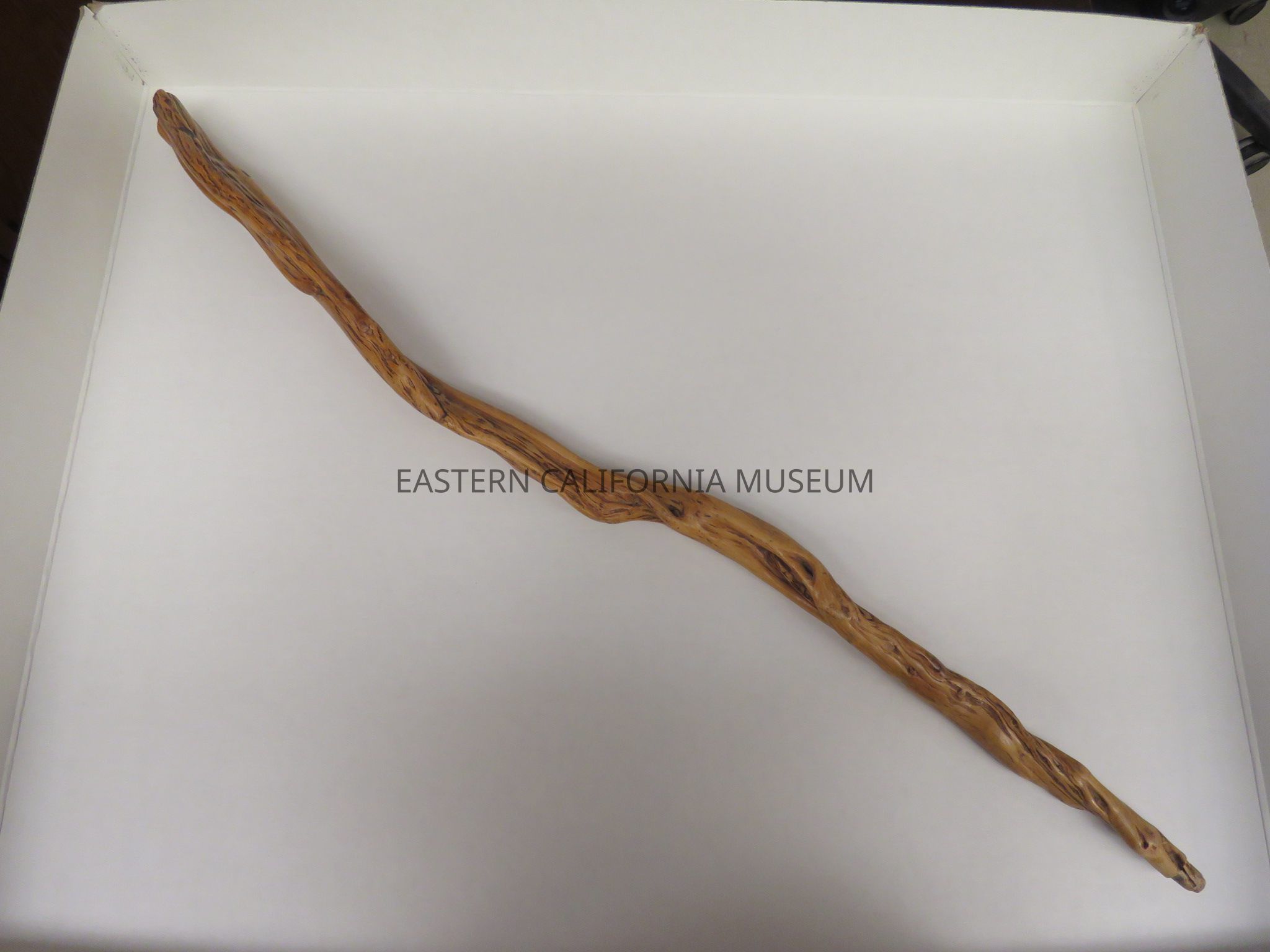 Light brown cane, possibly manzanita wood, curved and gnarly. The metal tip is missing. Likely made at Manzanar War Relocation Center.