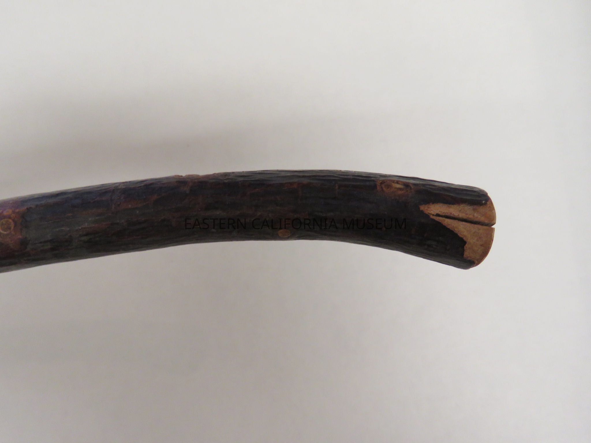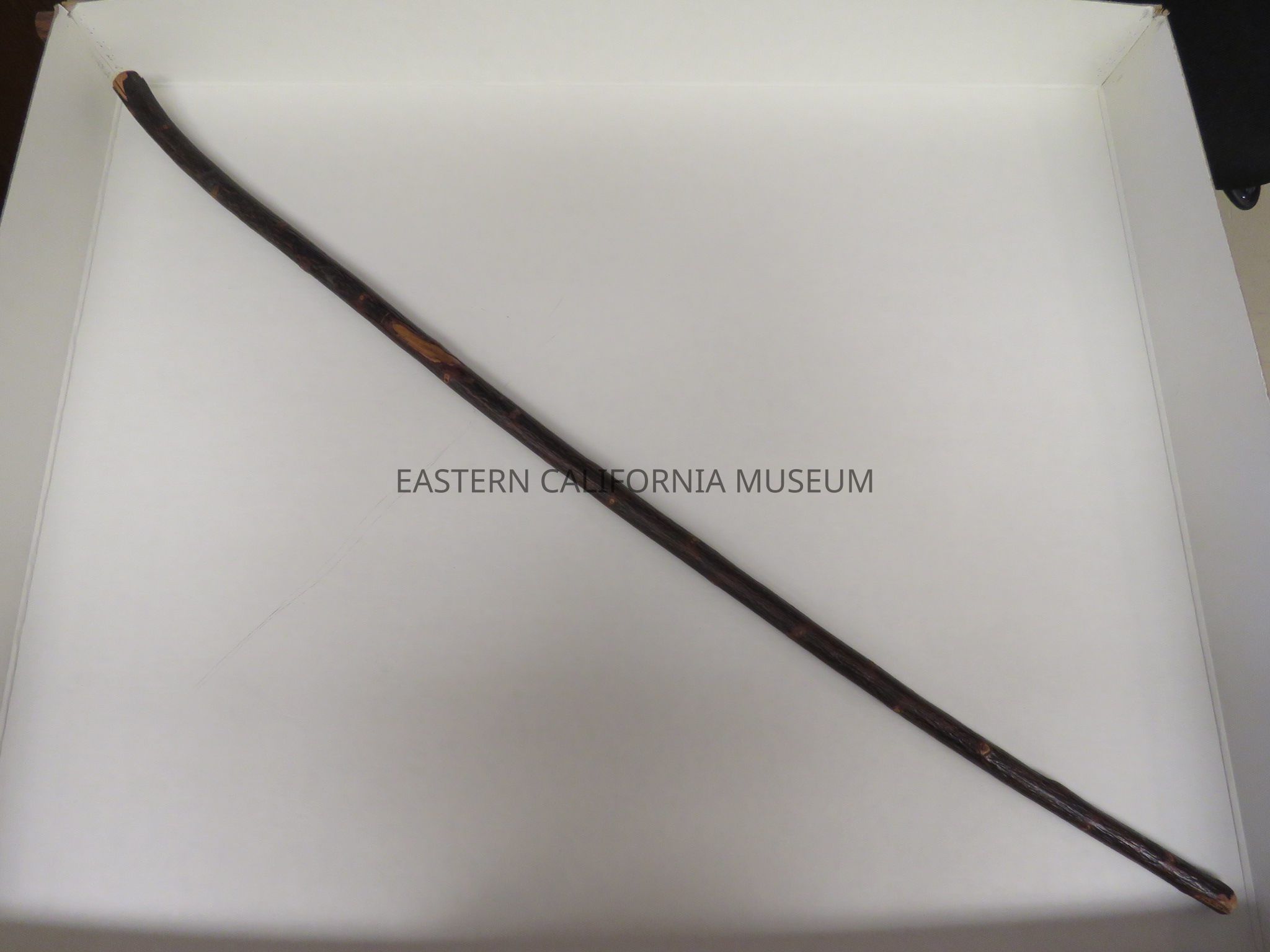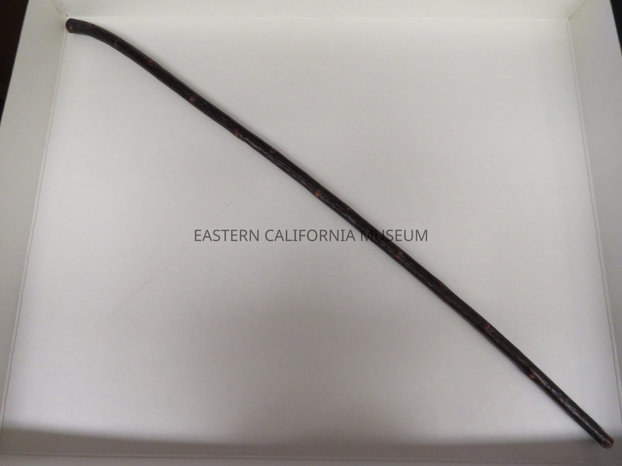 Dark wood cane, possibly made from locust wood. It looks like a limb with all the side twigs cut off and varnished. It is straight except for a slight curve near top. It was likely made at Manzanar War Relocation Center.Collection