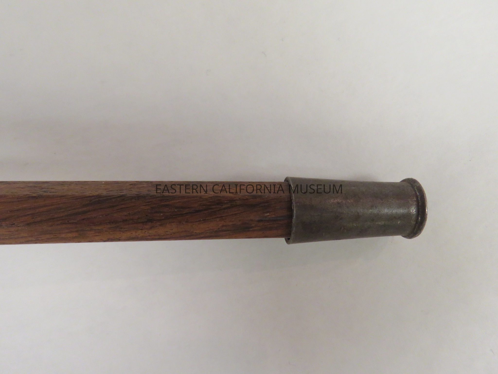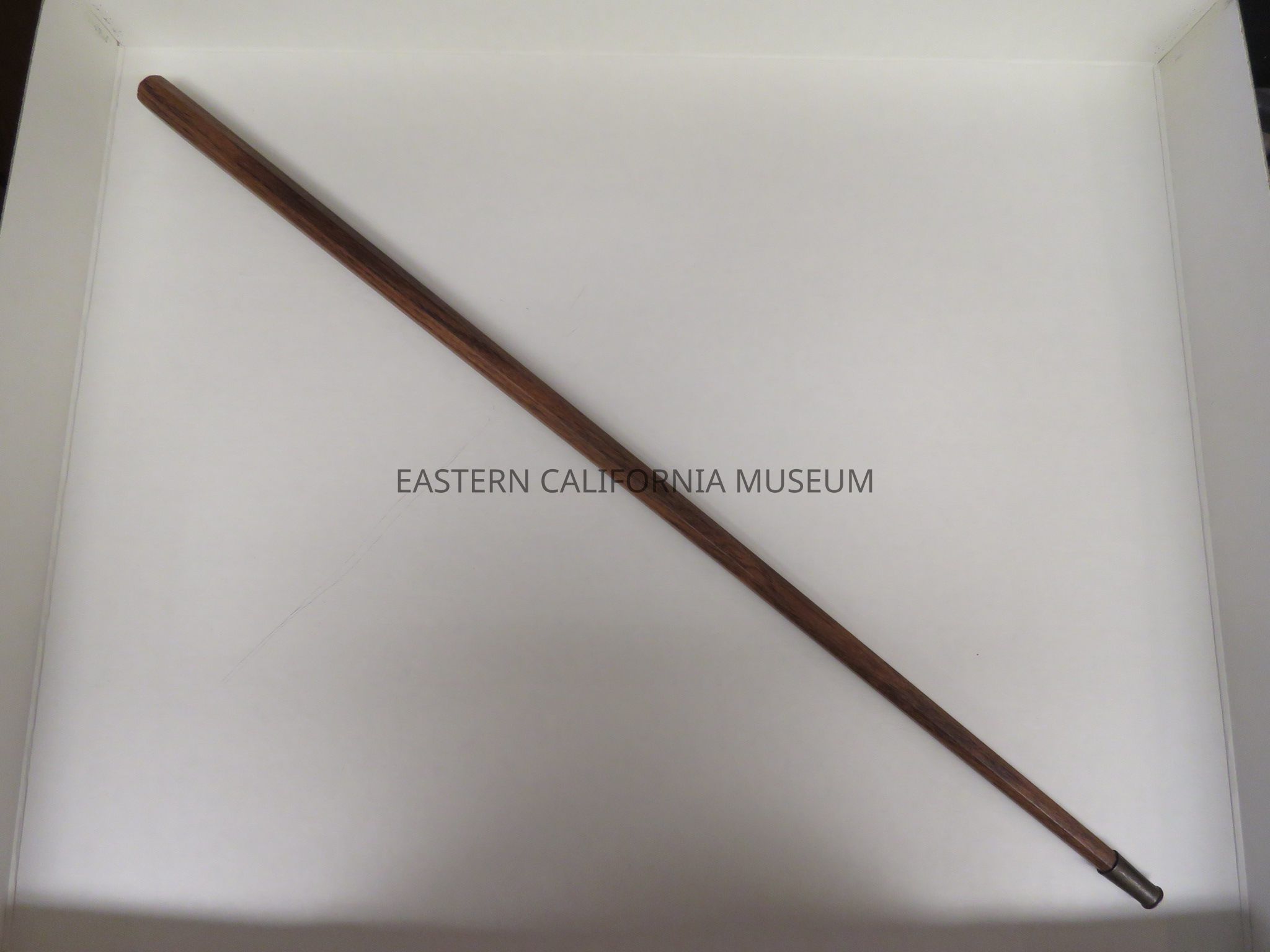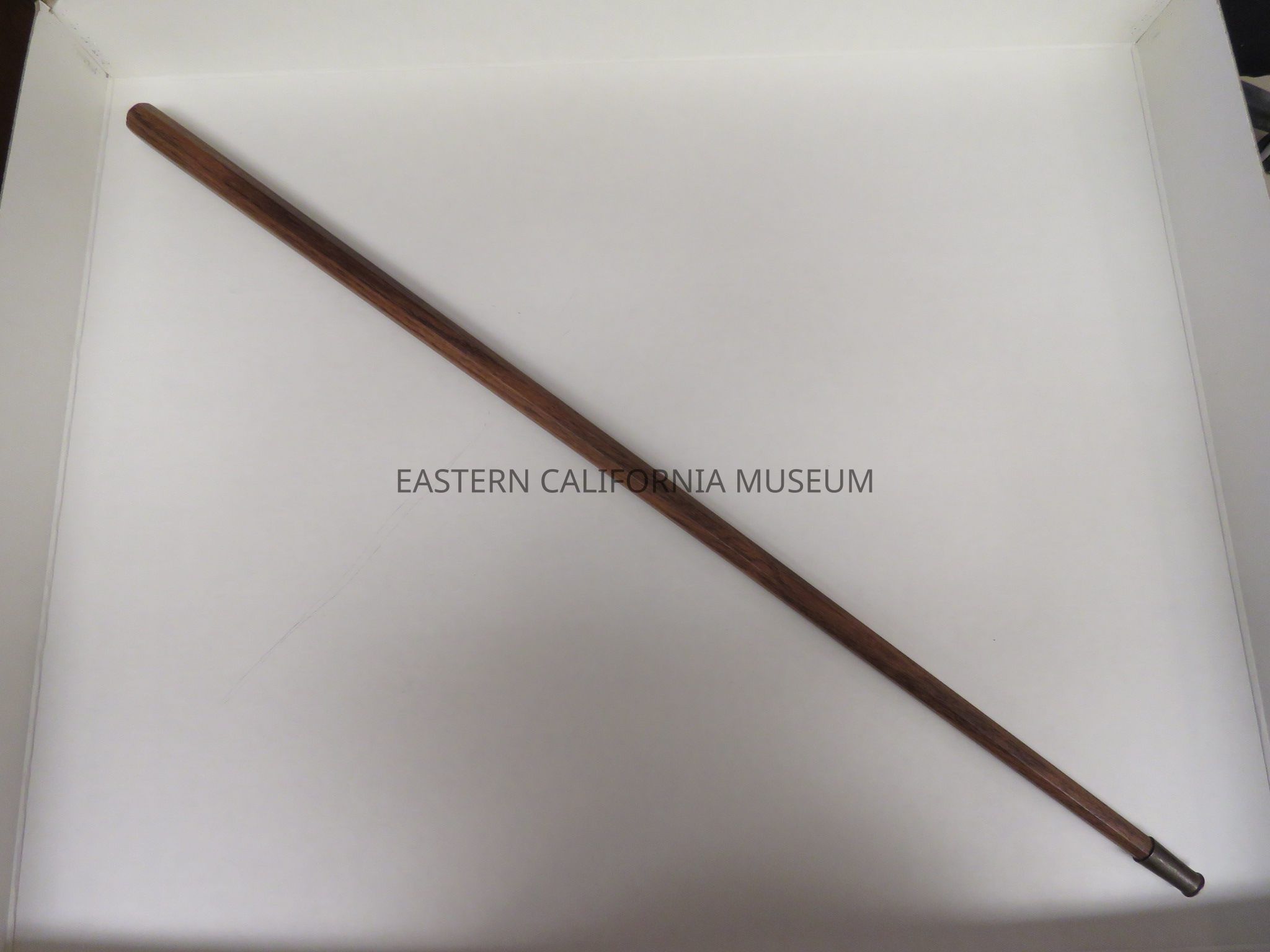 Octagon walnut stained wood cane with a metal tip. It was likely made at Manzanar War Relocation Center.