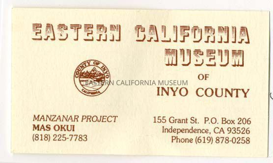 Mas Okui's business card for his work on the Manzanar Project at the Eastern California Museum.