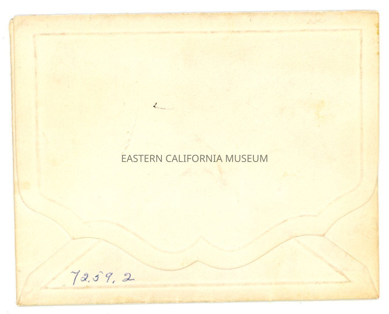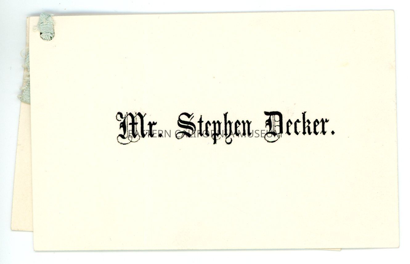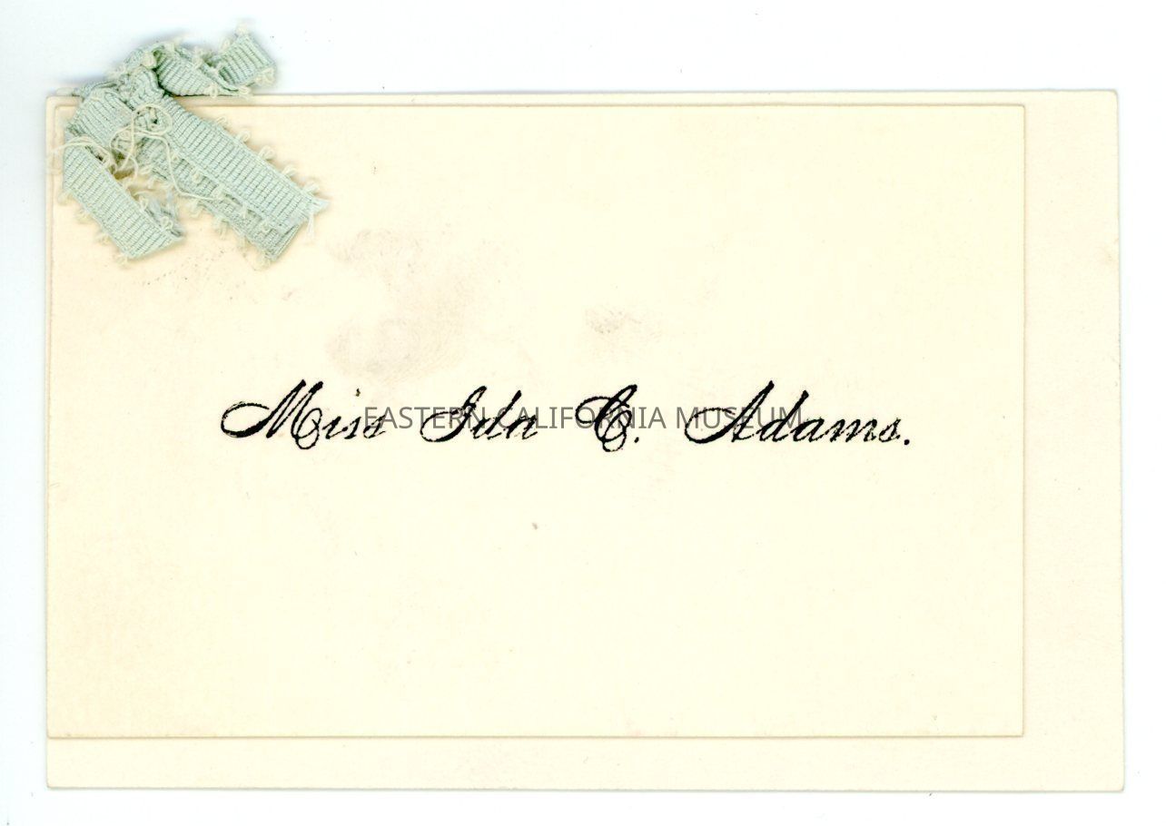 Two calling cards fastened together with a narrow light blue grosgrain ribbon. The names on the cards are "Miss Ida C. Adams" and "Mr. Stephen Decker." The came in an envelope that is now in two pieces.Collection