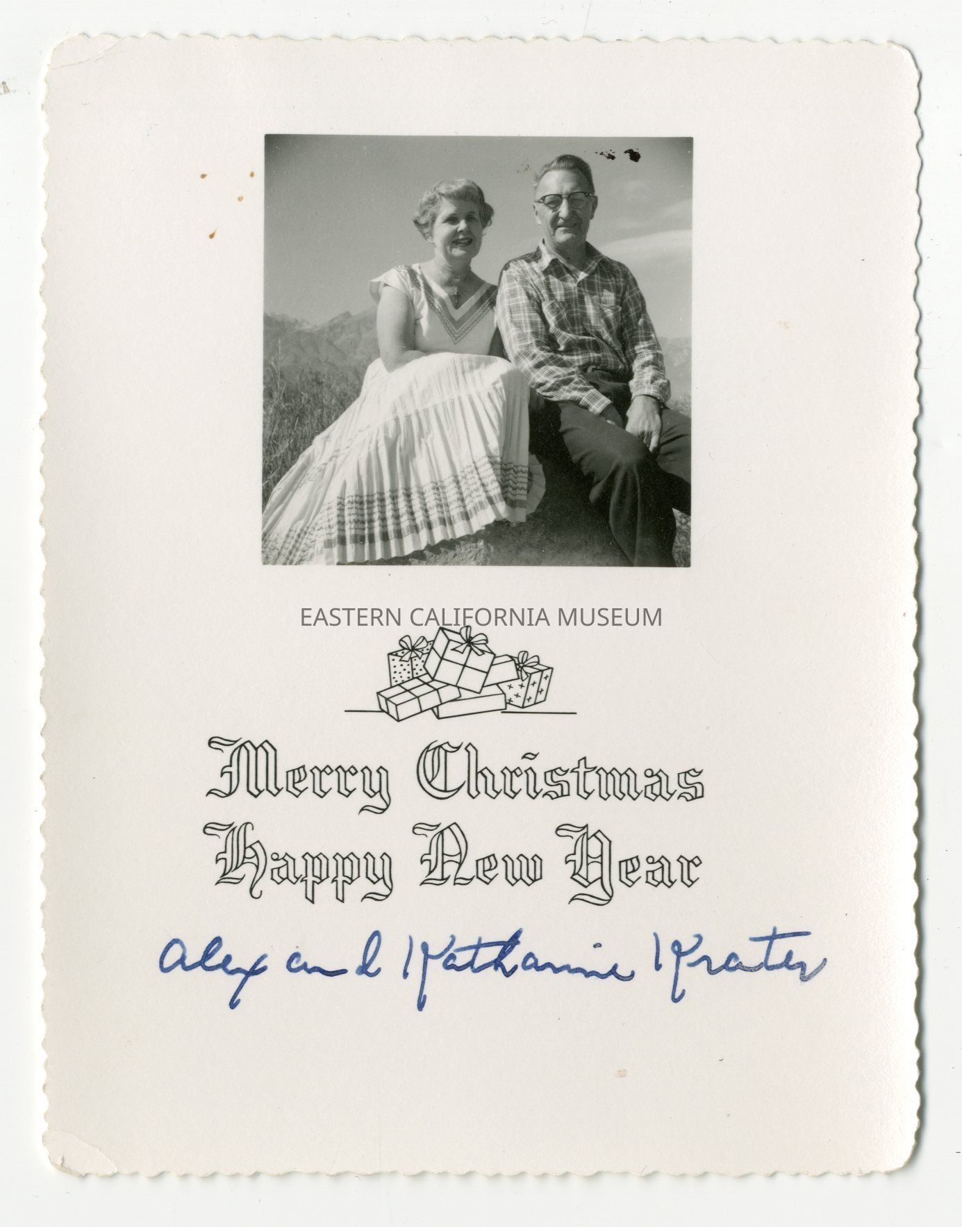 Christmas card from Alex and Katharine Krater with a photo of them sitting on a boulder with the Sierra Nevada mountain range in the background. It says, "Merry Christmas / Happy New Year" and is signed in blue ink "Alex and Katharine Krater."Collection