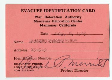 Red Evacuee Identification Card, War Relocation Authority, Manzanar Relocation Center. Dated July 5, 1943 for Claire Harada. Address 29-9-3. Stamped with Ralph P. Merritt's signature.Collection