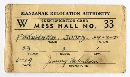 Manzanar Relocation Authority Identification Card Mess Hall No. 33 for Jimmy Fukuhara, ID #2903-D, address 33-3-1, dated 6/19, signed by Jimmy Fukuhara.Collection