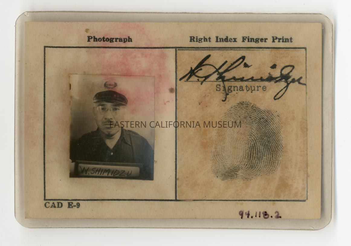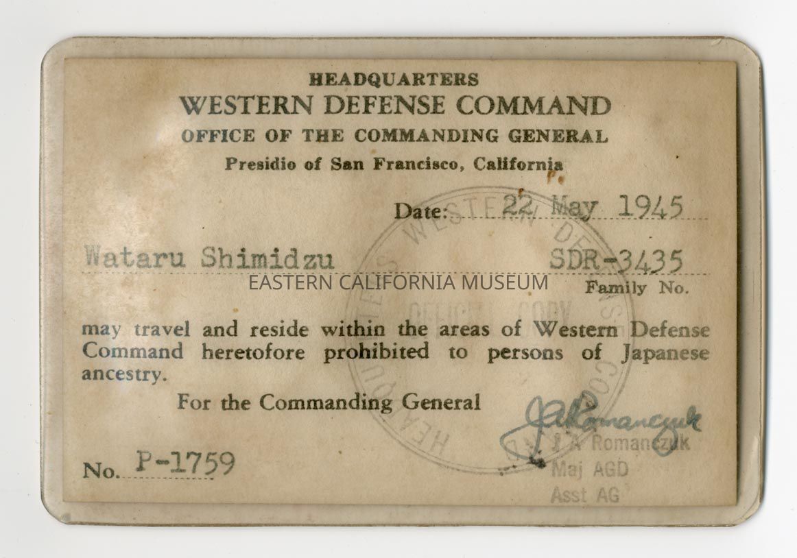 Laminated identification card #P-1759 issued by Headquarters Western Defense Command, Office of the Commanding General, Presidio of San Francisco, California on May 22, 1945 to Wataru Shimidzu, family #SDR-3435, granting him permission to travel and reside within the areas of Western Defense Command heretofore prohibited to persons of Japanese ancestry. Signed/stamped for the Commanding General by J. A. Romanzuk, Maj. AGD, Asst. AG.