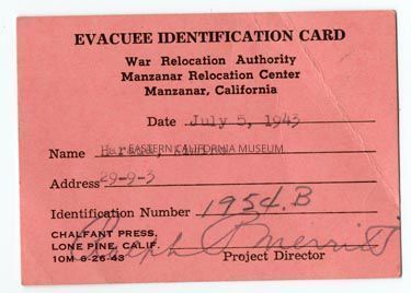 Red Evacuee Identification Card, War Relocation Authority, Manzanar Relocation Center. Dated July 5, 1943 for Kimino Harada. Address 29-9-3. ID #1954-B. Stamped with Ralph P. Merritt's signature.Collection