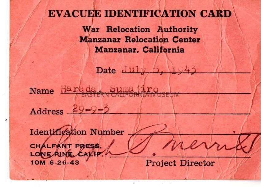 Red Evacuee Identification Card, War Relocation Authority, Manzanar Relocation Center. Dated July 5, 1943 for Sumajiro Harada. Address 29-9-3. Stamped with Ralph P. Merritt's signature.Collection
