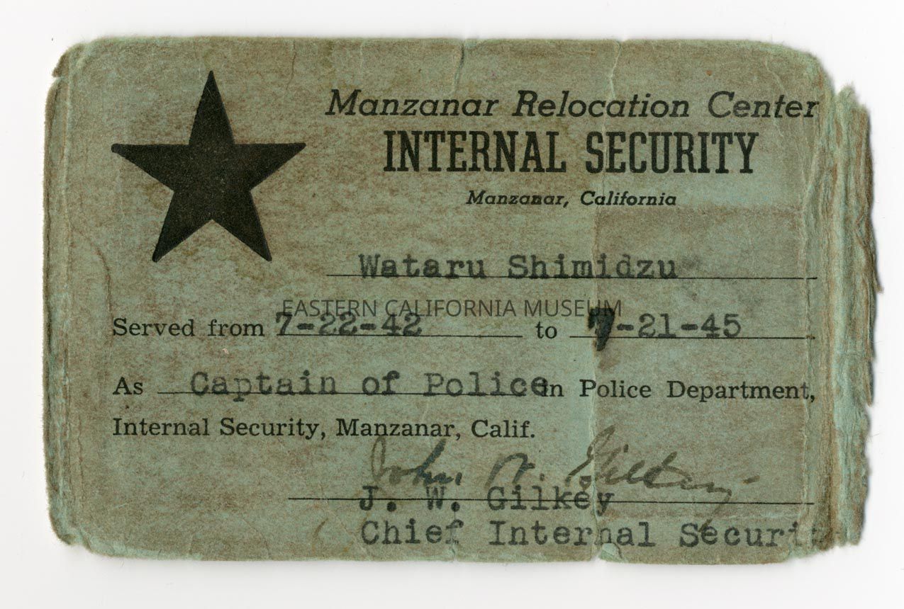 Worn identification card issued by Manzanar Relocation Center Internal Security, Manzanar, California to Wataru Shimidzu, who served from 07/22/1942 to 07/21/1945 as Captain of Police in Police Department, Internal Security, Manzanar, Calif. It is signed by John W. Gikley, Chief Internal Security.