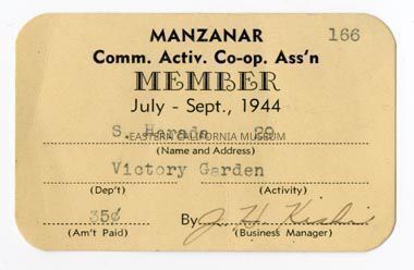 Manzanar Comm. Activ. Co-op. Ass'n Member July-Sept 1944. S. Harada, address 29, Victory Garden, 35 cents, signed by Business Manager J. H. Kishi (sp?).Collection