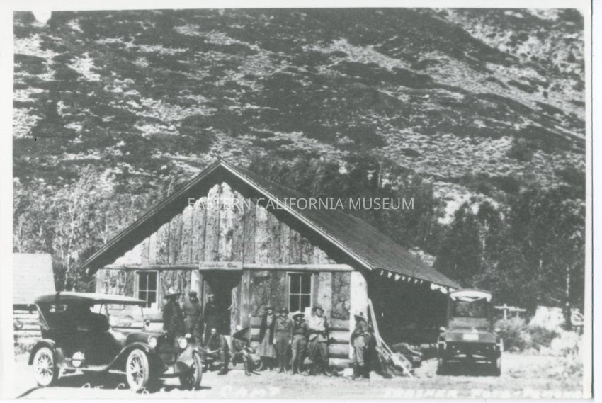 B&W glossy print: log cabin at base of a mountain, 2 early model cars out front and several people