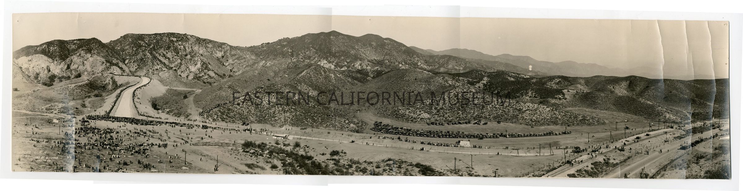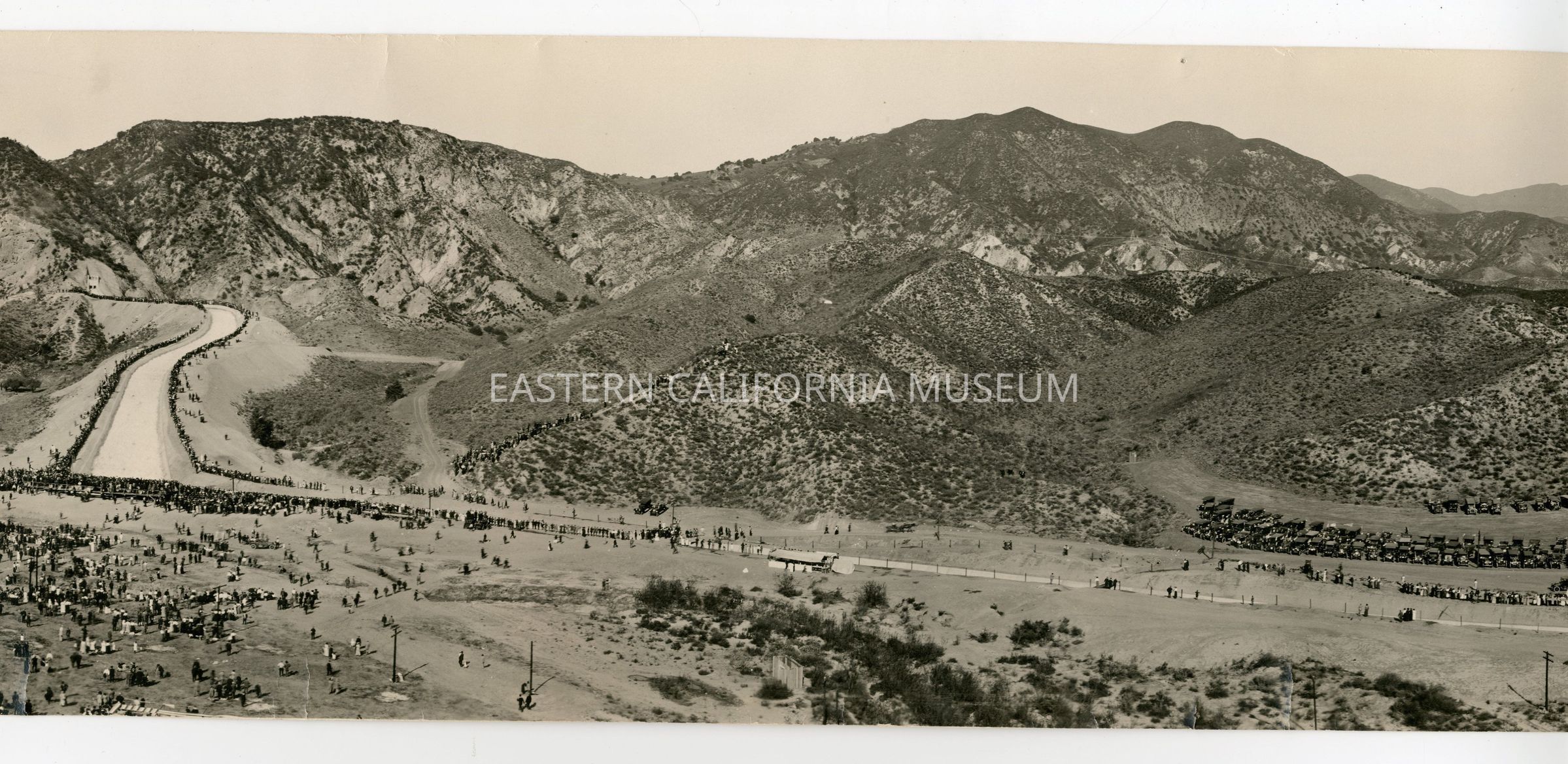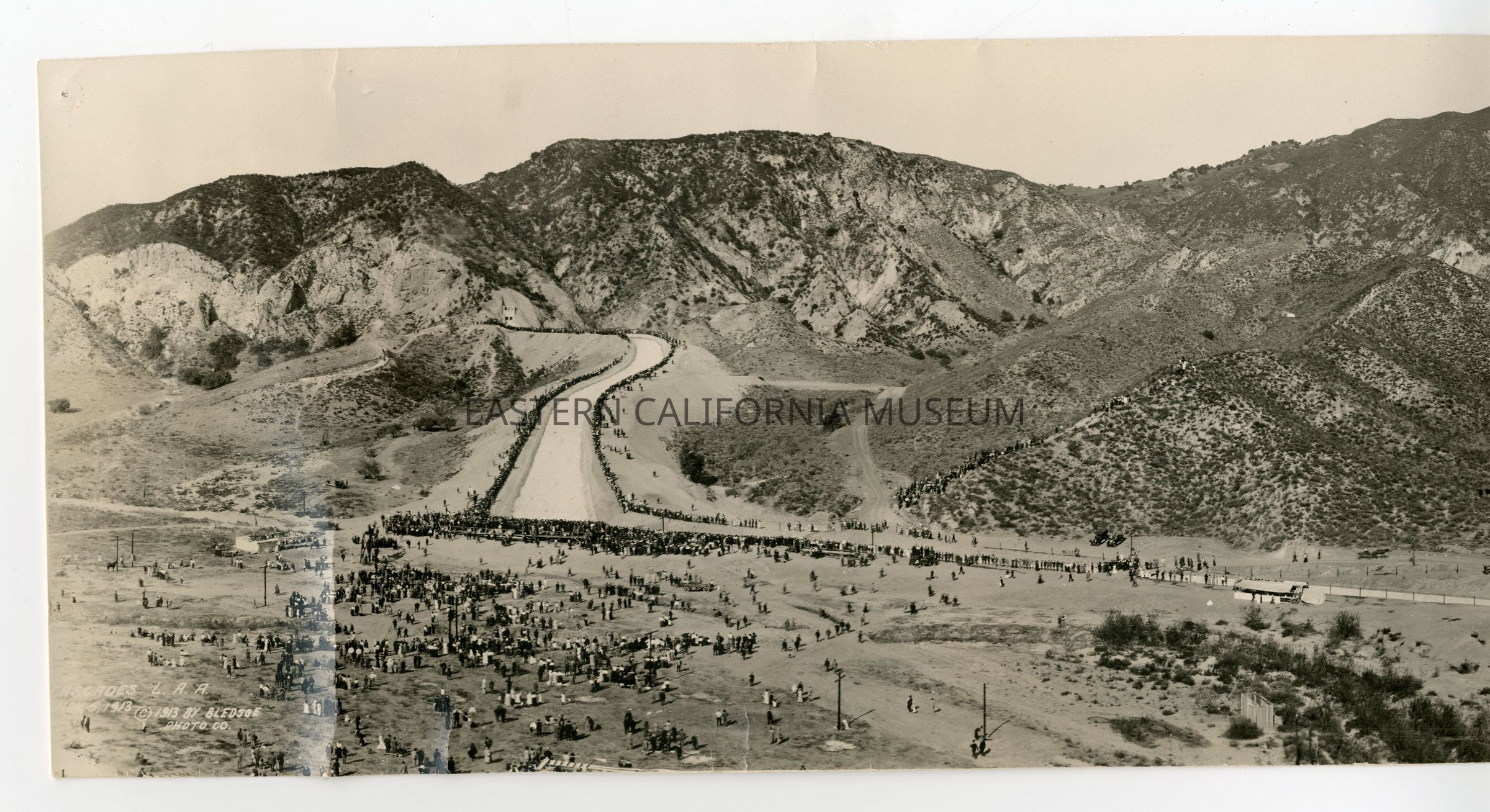 Panorama photo titled, "Cascades, L.A.A., Nov. 5, 1913" taken by Bledsoe Photo Co. It shows water rushing down the spillway during the aqueduct dedication ceremony with a crowd of onlookers.Collection