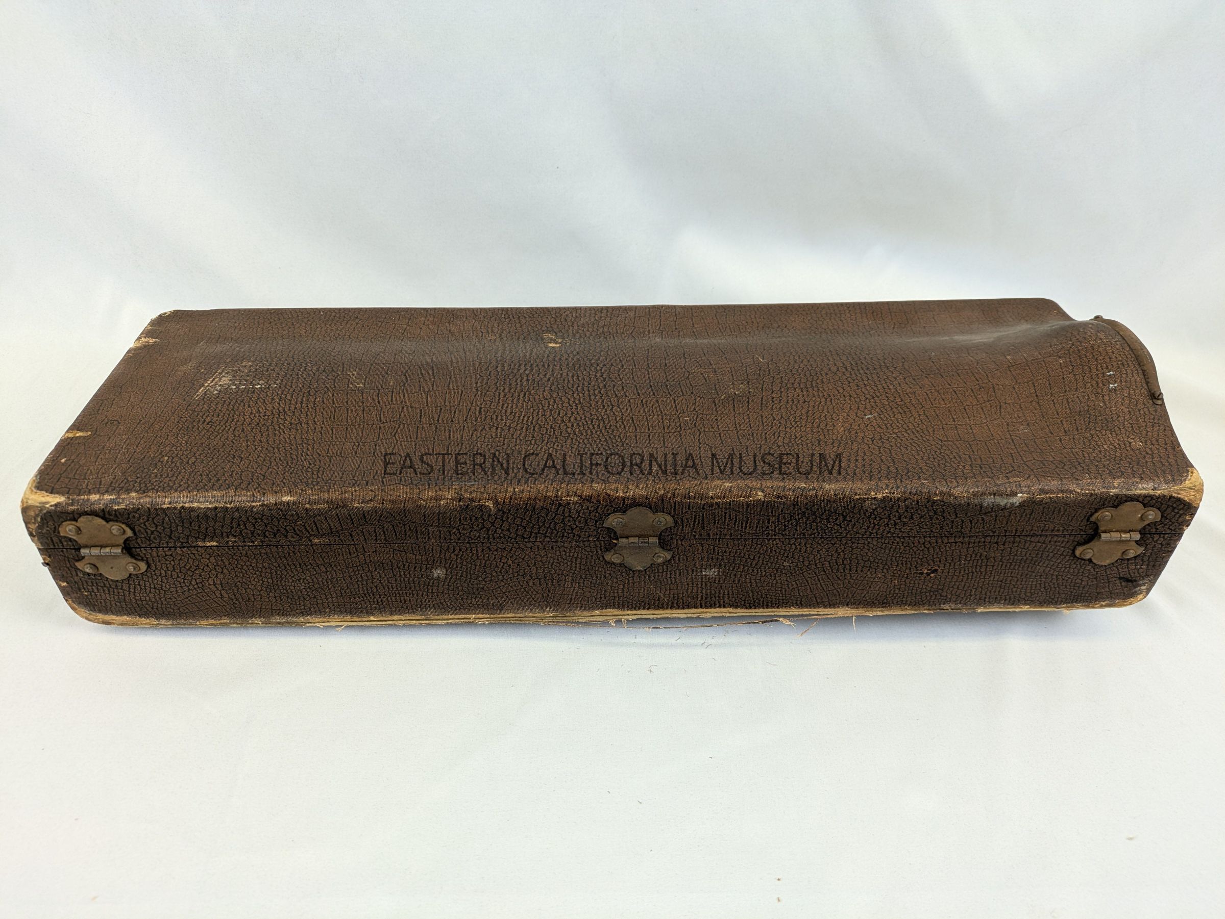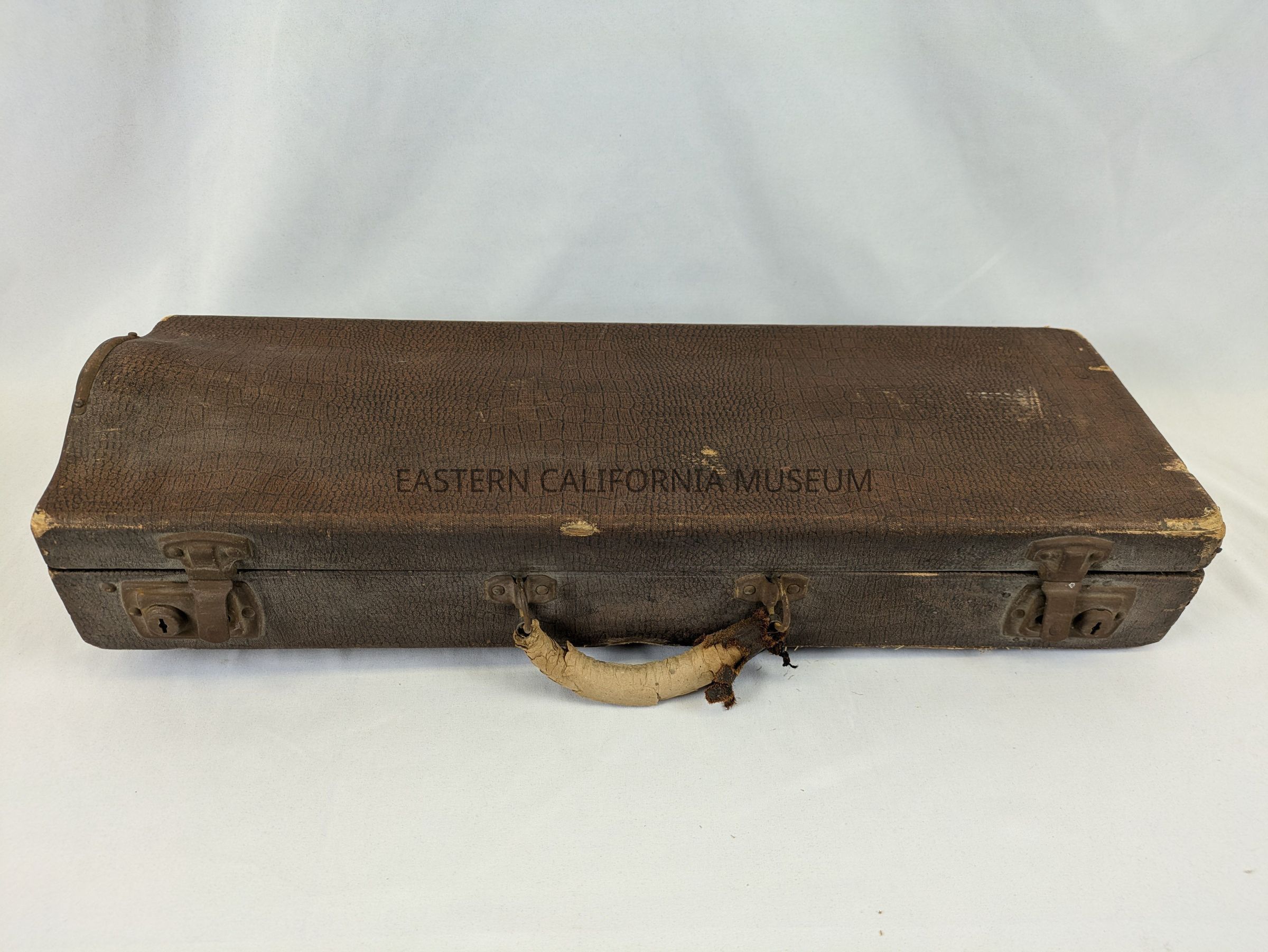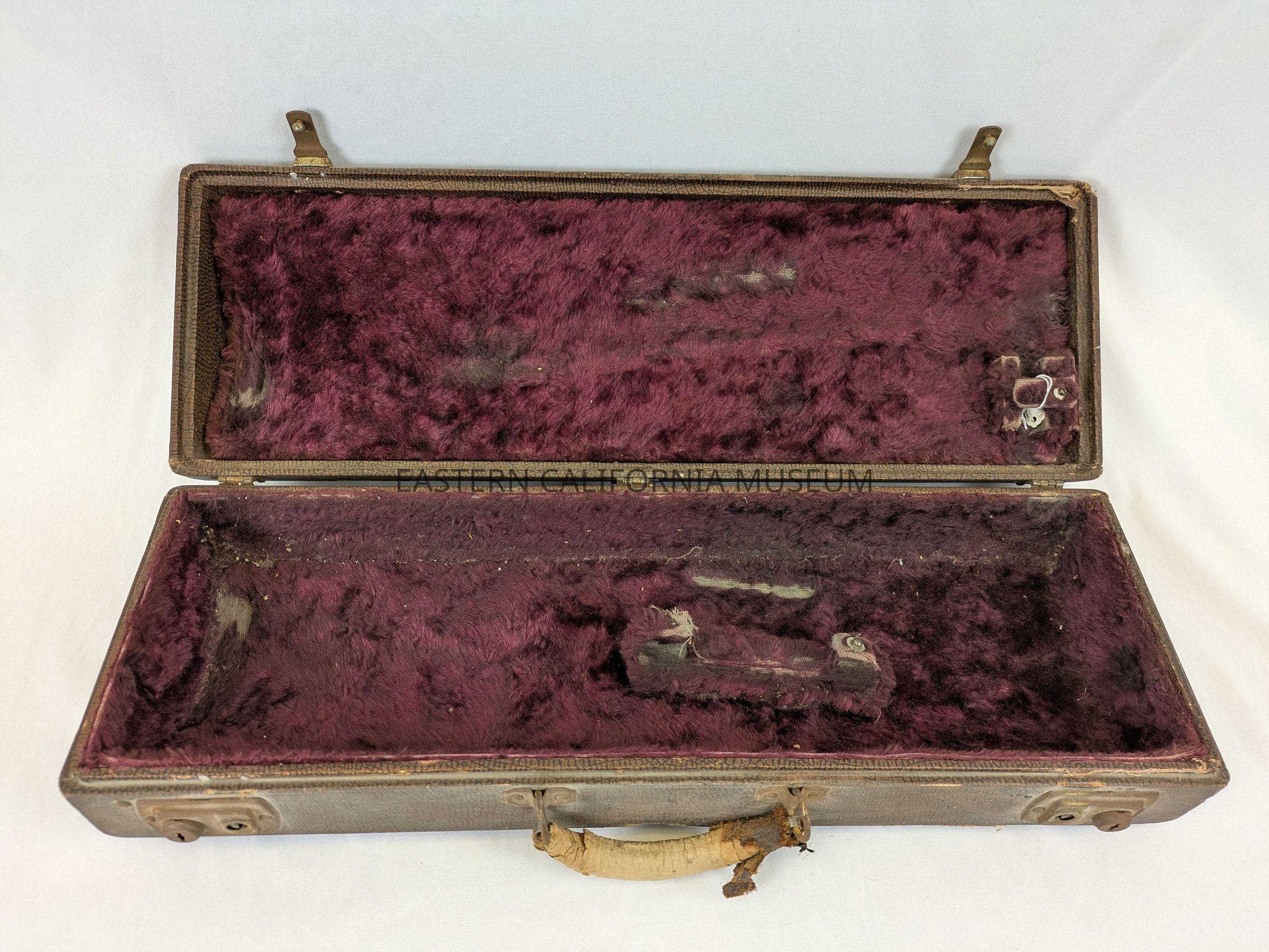 Worn, brown trumpet case with purple lining that was used at Manzanar War Relocation Center. The handle is very worn, with most of the leather missing. It has two rusted metal hinges with locks.