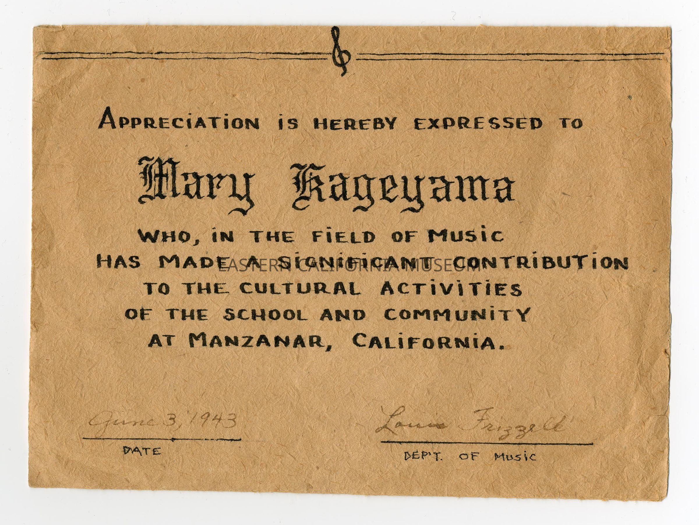 Commendation to Mary Kageyama from Louis Frizzell for significant contribution to the cultural activities of the school and community at Manzanar in the field of music, June 3, 1943.Collection
