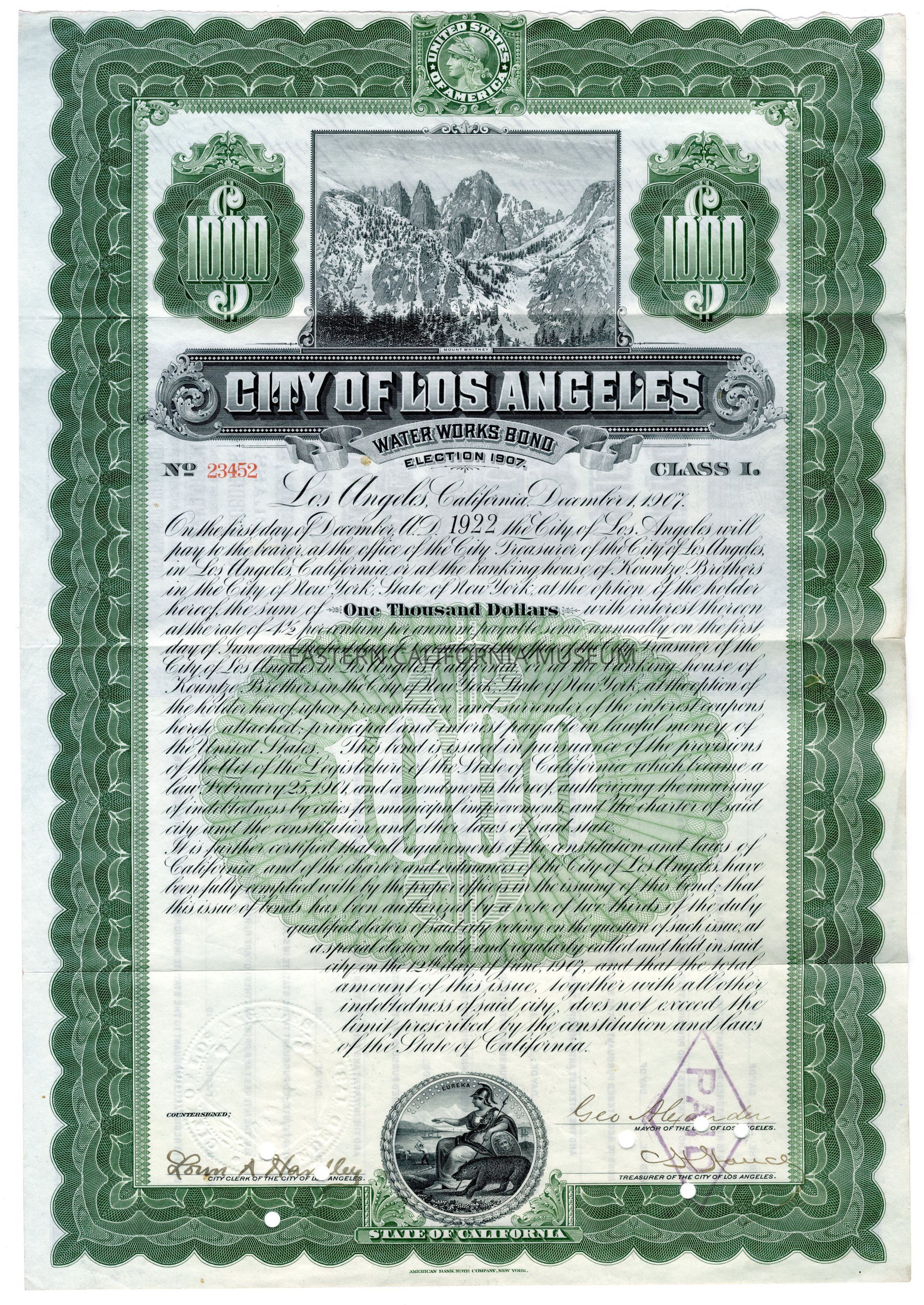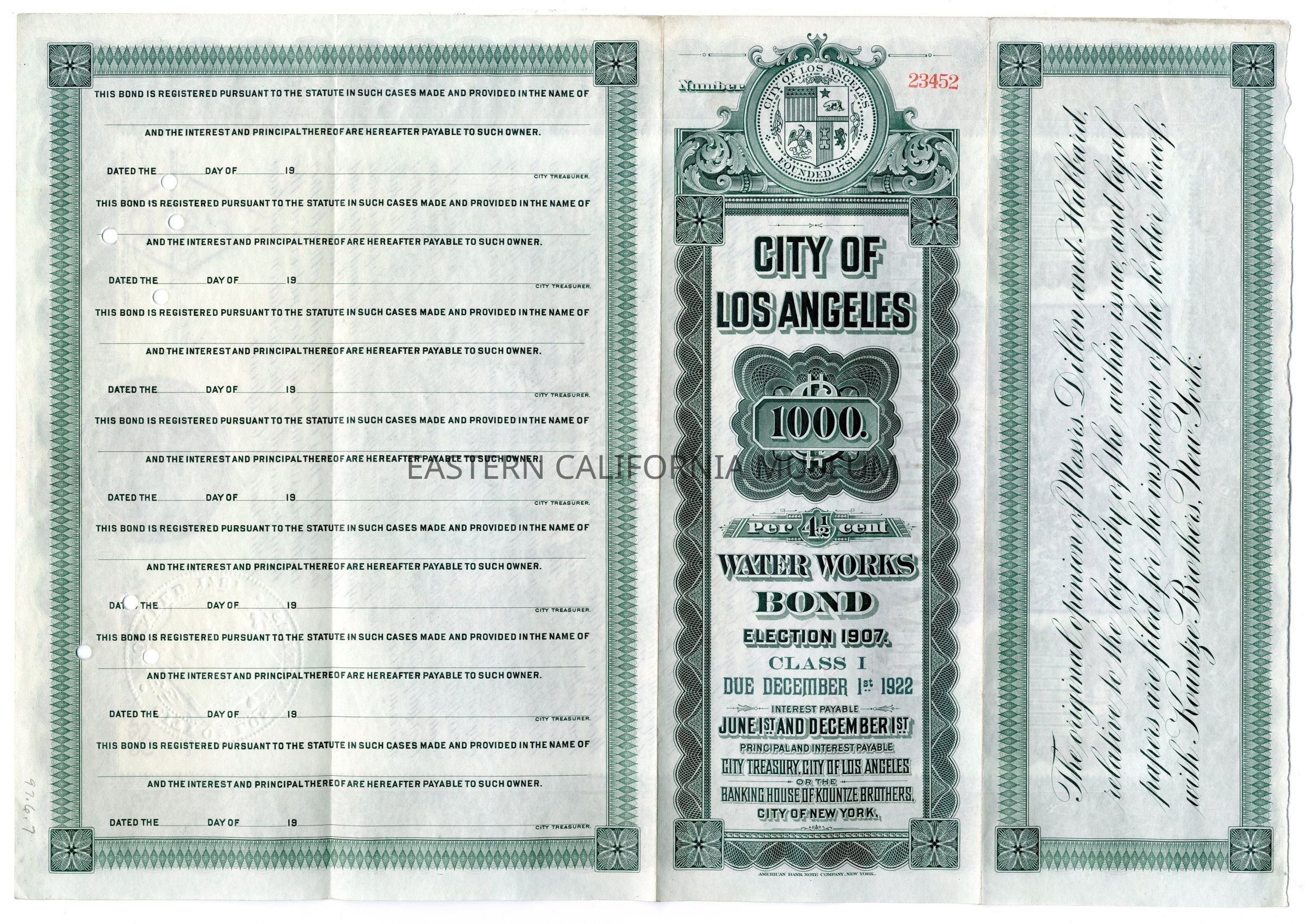 City of Los Angeles Water Works Bond, Election 1907, due December 1, 1922, #23452.