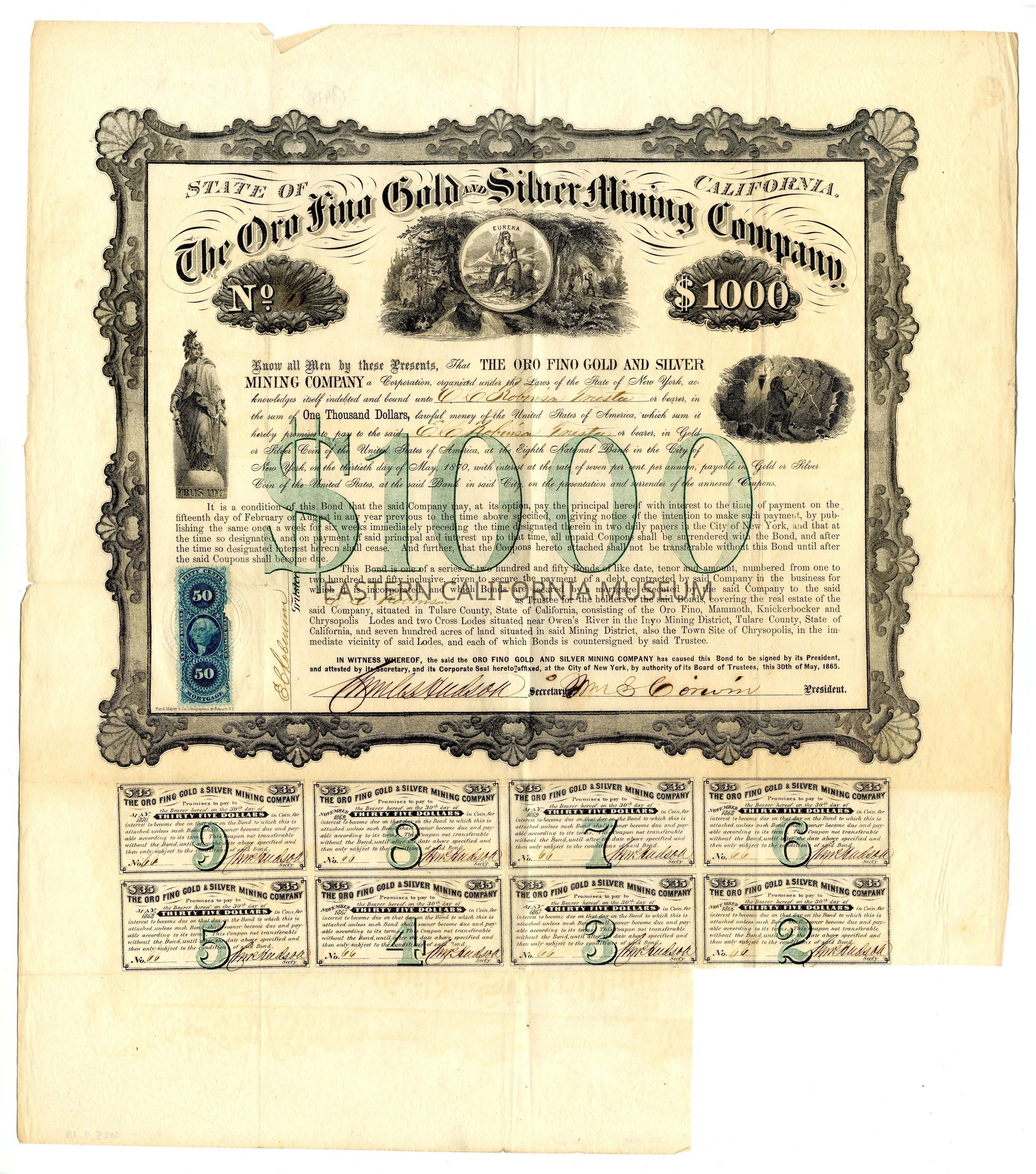 $1,000 bond certificate for the Oro Fino Gold and Silver Mining Company. It was purchased by E. C. Robinson and was to be fully redeemed on 05/30/1870 with an interest rate of 7% per year. There are eight coupons with the bond (numbers 2 through 9), and coupon #1 may have been redeemed (lower right corner is cut off). There were 250 bonds printed, of which this is number 66. It is signed by the company's President, William S. Corwin, and Secretary, Miles Hudson, and is dated 05/30/1865.