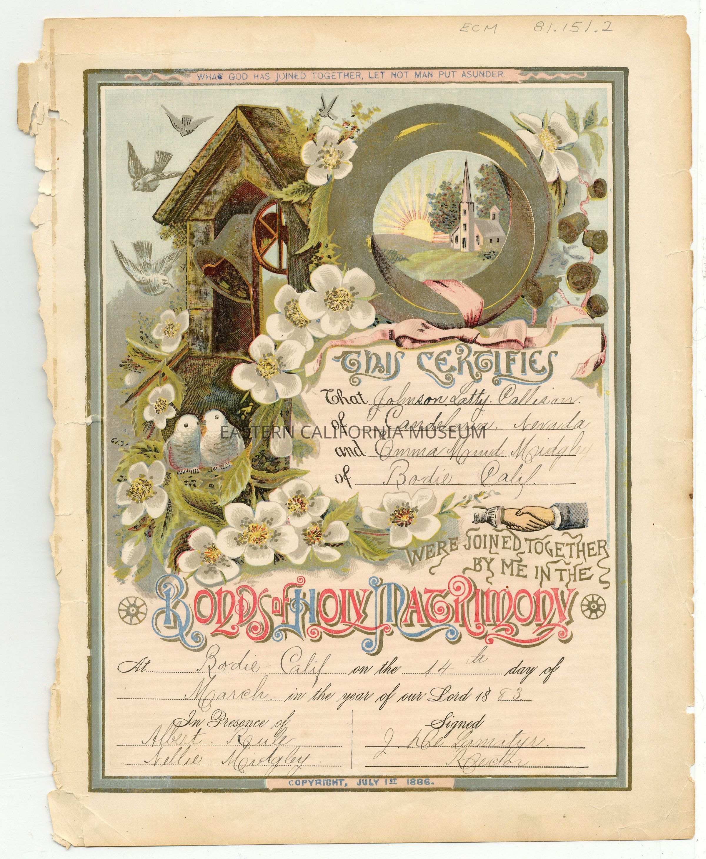 Marriage certificate for Johnson Latty Callison of Candelaria, NV and Emma Maud Midgley of Bodie, CA, who were married at Bodie on March 14, 1883 in the presence of Albert Rule and Nellie Midgley. It is signed by J. DeLamatyr, Rector.