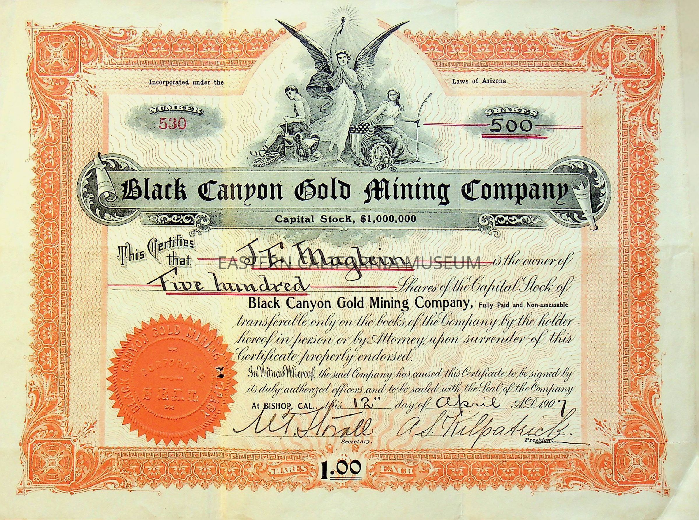 Black Canyon Gold Mining Company capital stock certificate no. 530 for 500 shares. It was purchased by J. E. Maglein at Bishop, CA on April 12, 1907. It is signed by A. S. Kilpatrick, President, and M. T. Stovall, Secretary.