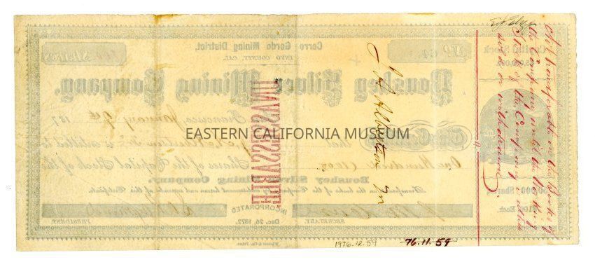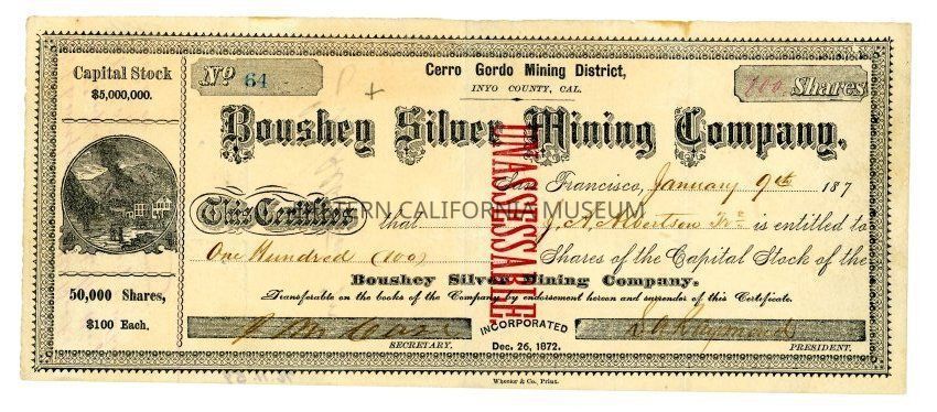 Stock certificate #64 purchased by J. A. Albertson Jr. for 100 shares of the capital stock of the Boushey Silver Mining Company in the Cerro Gordo Mining District of Inyo County, Cal. Signed by J. M. Case, Secretary, and S. A. Raymond, President. Dated January 9th, 187_. Incorporated December 26, 1872. Printed by Wheeler & Co. Stamped in the center in red ink is "unassessable."