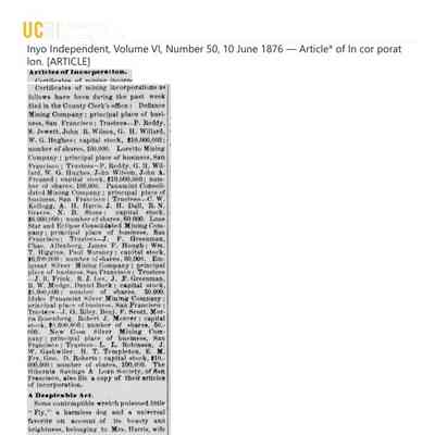 The Loretto Mining Company was incorporated 12/13/1875. This stock certificate was printed by noted African American lithographer G. T. Brown of San Francisco. The location is said to have been in the Darwin area.