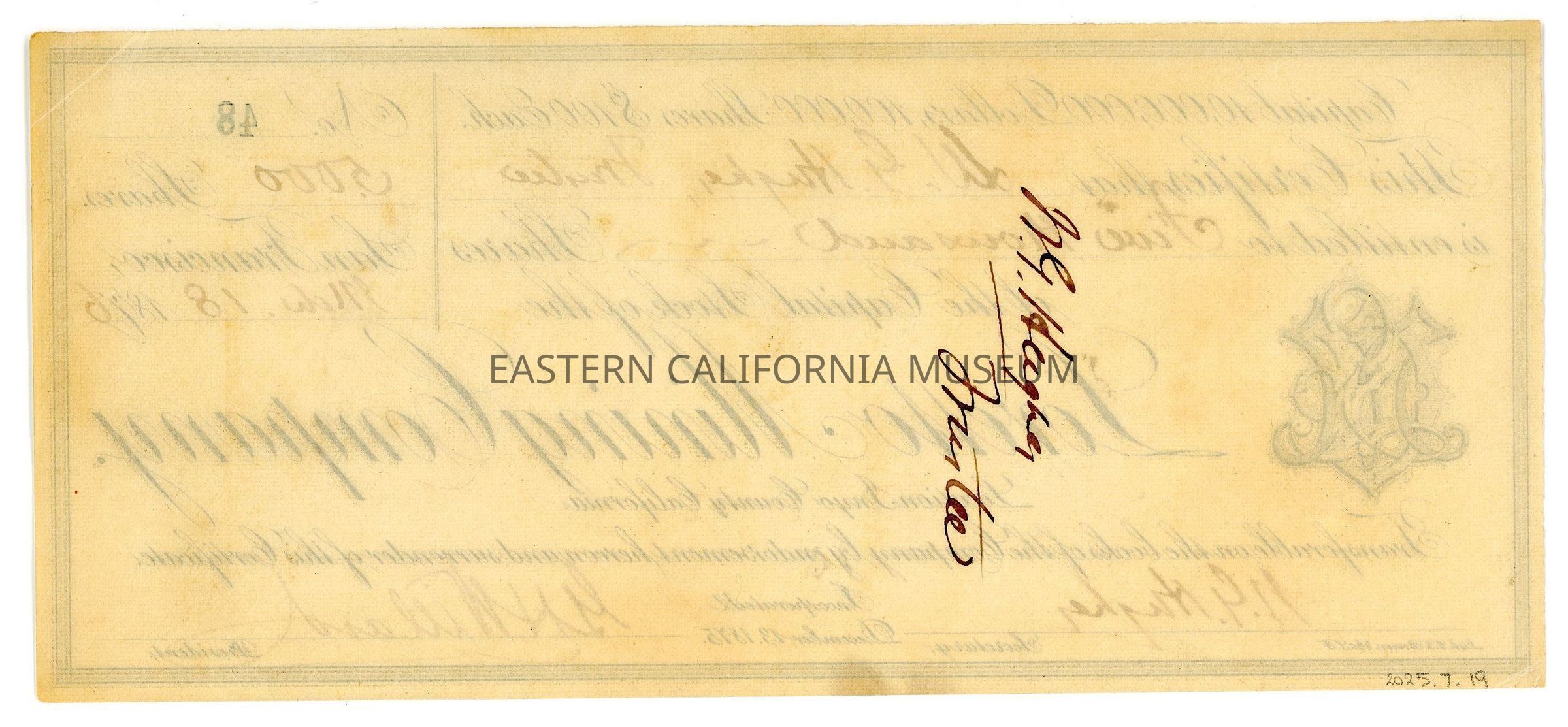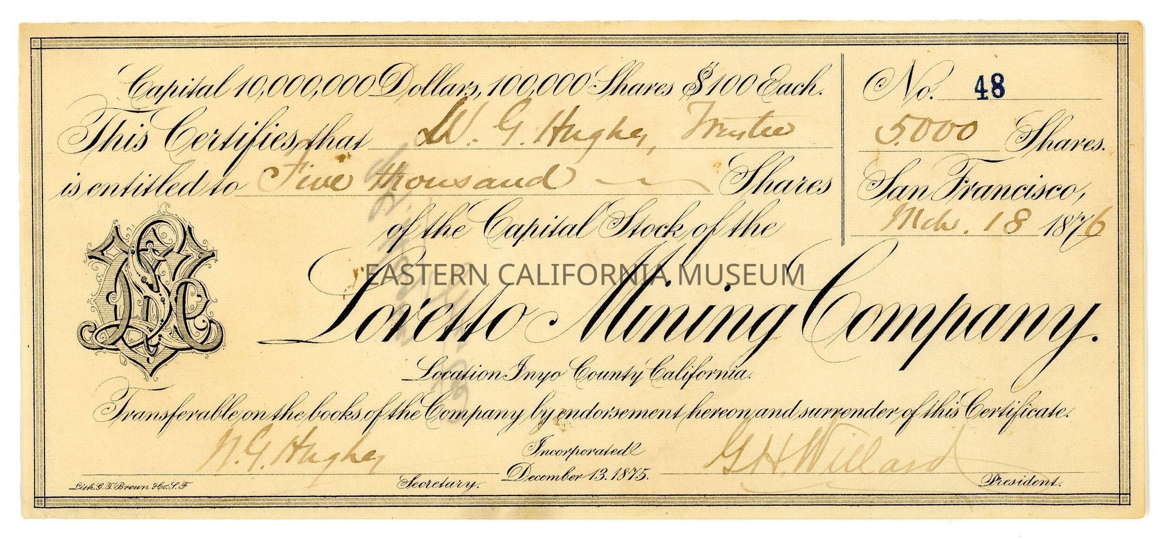 Stock certificate number 48 dated 03/18/1876 for 5,000 shares at $100 each of the capital stock of the Loretto Mining Company, located in Inyo County, California. This was purchased or given to the company's secretary, [W. G. or N. G.] Hughes and signed by both him and G. H. Willard, the company President.
