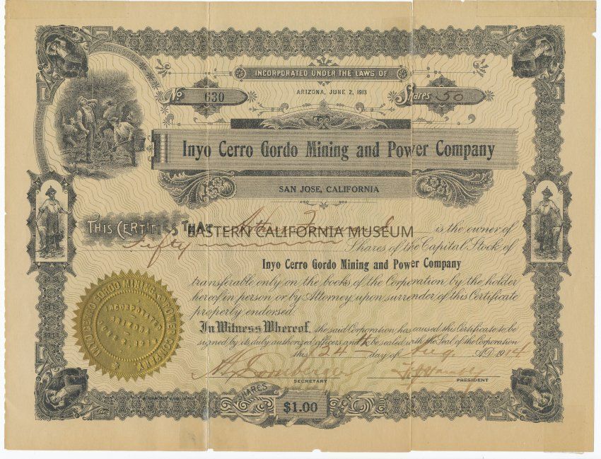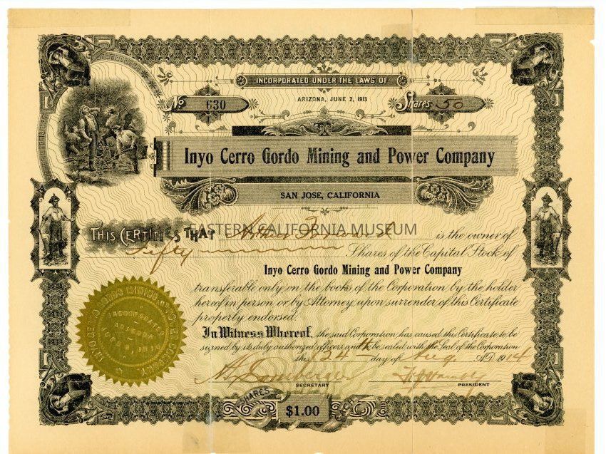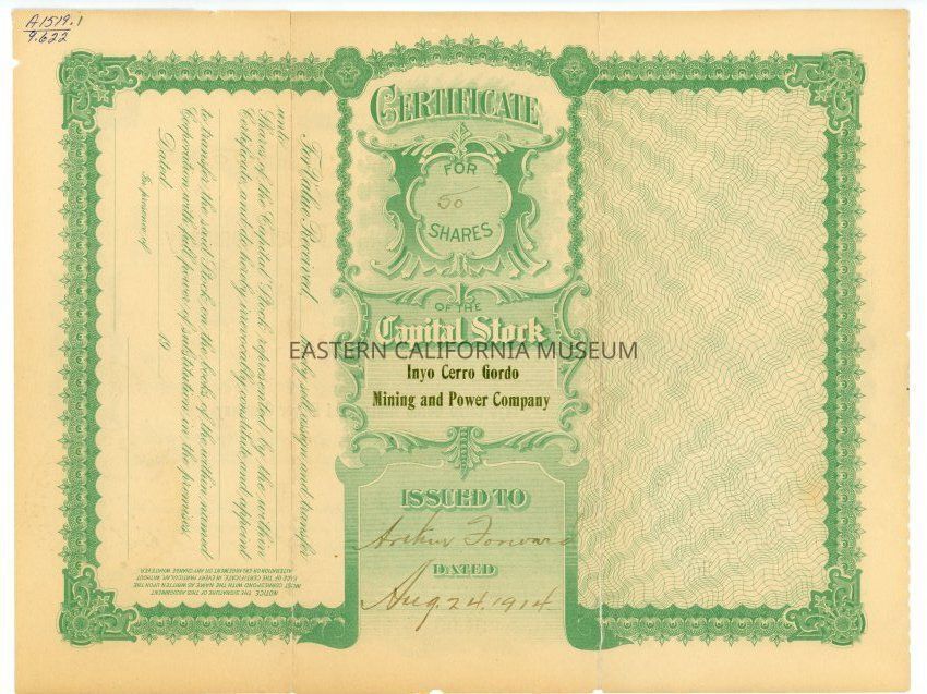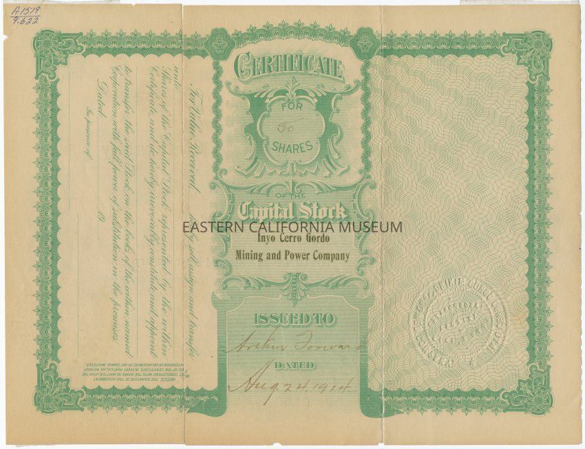 Incorporated under the laws of Arizona, June 2, 1913, Inyo Cerro Gordo Mining and Power Company, San Jose, California. Certificate number 630 for 50 shares at $1.00 each issued to Arthur Forward on August 24, 1914. Signed by Secretary A. L. Dornberger and President F. J. Hambly.