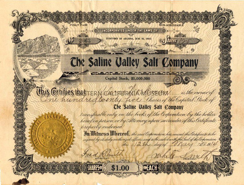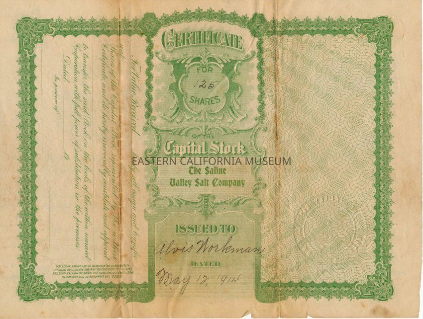 Stock certificate, Saline Valley Salt Company, May 12, 1914 No. 2063, 125 shares; $1 per share; owner, Alvis Workman; signed by Saline Valley Salt Company President, White Smith, and Secretary, Fred R. Smith; color off-white on front side; color green and off-white on back side